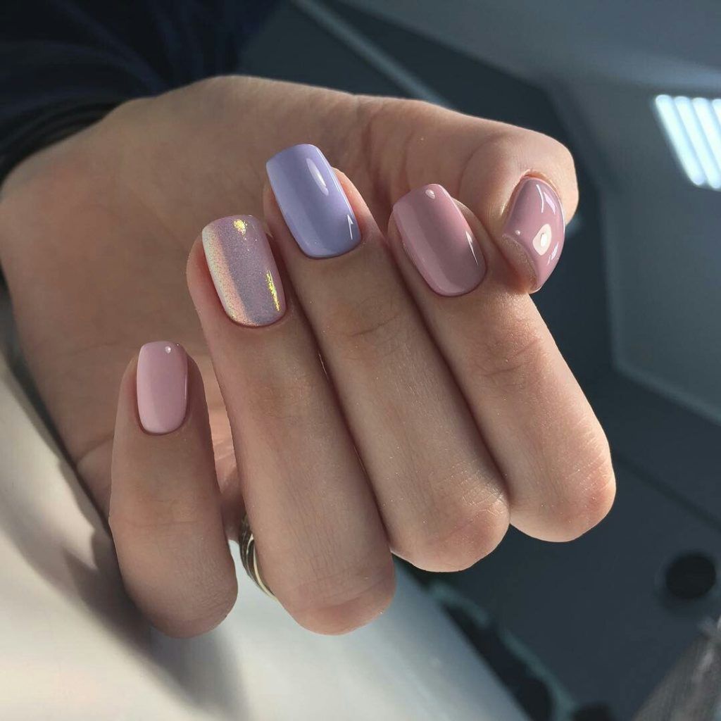 Можно комбинировать яркие и пастельные тона, выделять другим цветом или с помощью декора один либо несколько ногтей, наносить геометрические элементы.