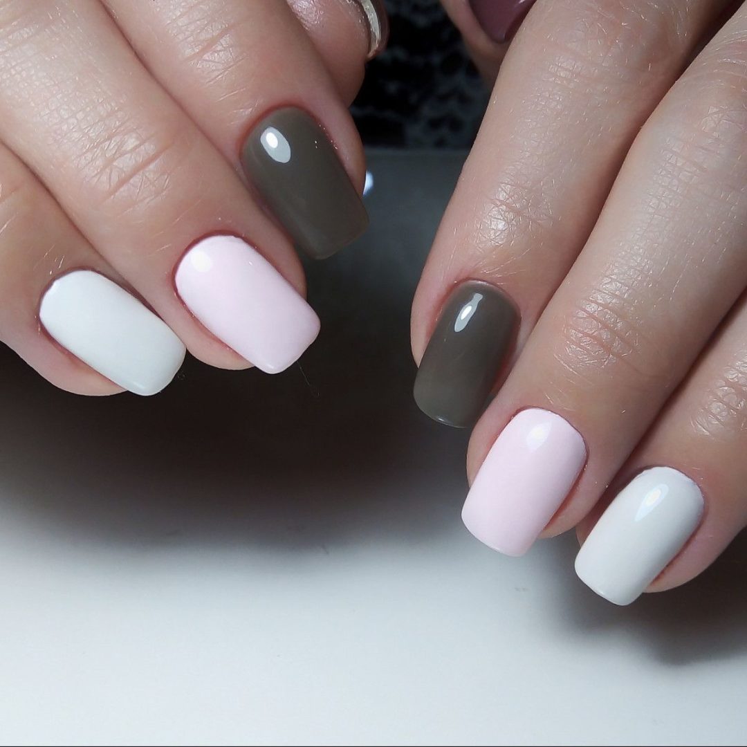Можно сочетать в офисном маникюре сразу несколько спокойных цветов – белый, серый, темно-зеленый и розовый. Элементов дизайна также может быть несколько – стразы, фольгированная лента, мрамор.