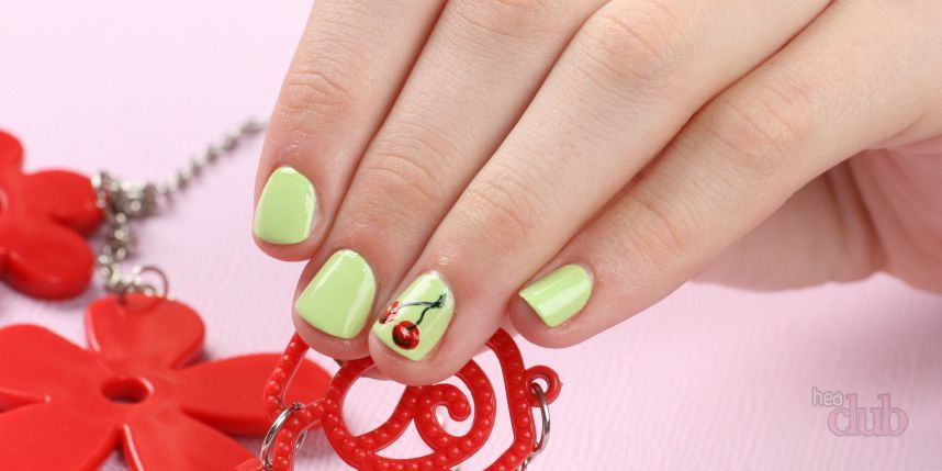 В летний сезон отличным вариантом дизайна будут изображения ягод и фруктов. К примеру, вишенки и клубника украшают ногти и делают маникюр немного более игривым и веселым.