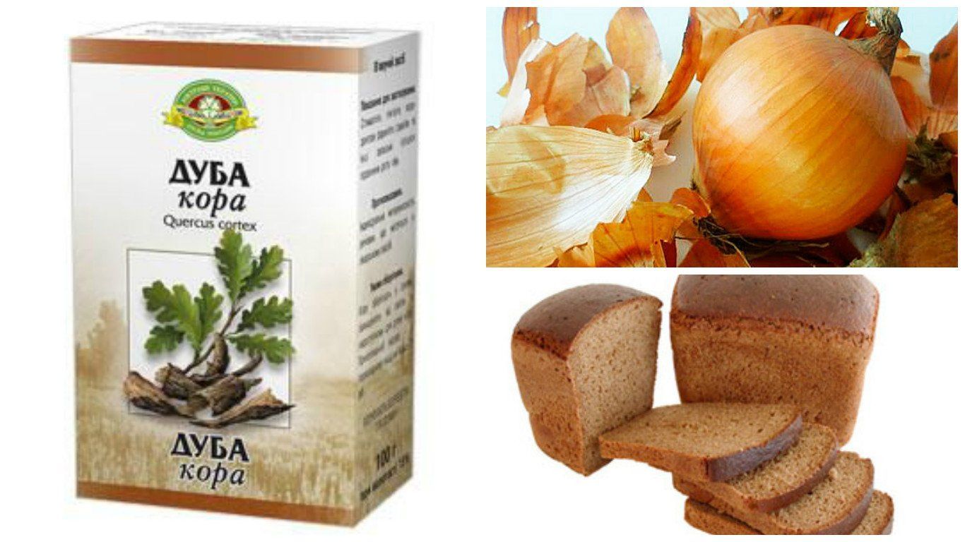 Состав: кора дуба (половина стакана), луковая шелуха (половина стакана), вода (1 литр), мякоть черного хлеба.