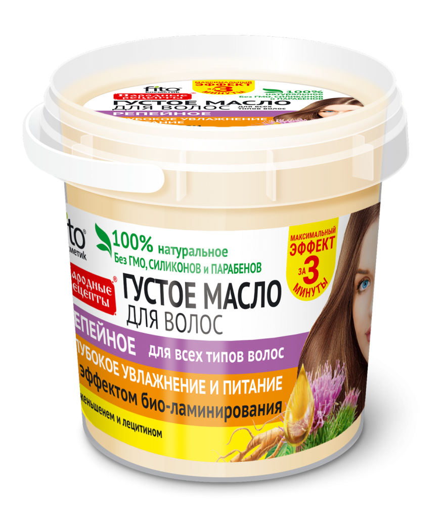 | 8 | Густое репейное | Настой облепихи, масло миндаля, репейное, сафлоровое, жожоба, кедрового ореха, экстракт женьшеня, лецитин | Ведерко объемом 155 мл | Питает, увлажняет, делает крепкими, плотными, волосы становятся пышнее, гуще, объемнее, дает эффект био-ламинирования |