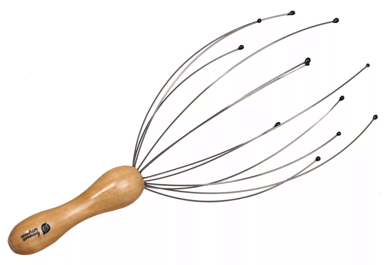 Самый простой, но действенный массажер для головы – ручной. Такая модель устройства визуально напоминает венчик для взбивания, на кончиках которого находятся эластичные силиконовые шарики. Массаж ручной моделью начинается по направлению от макушки до шеи или обратно