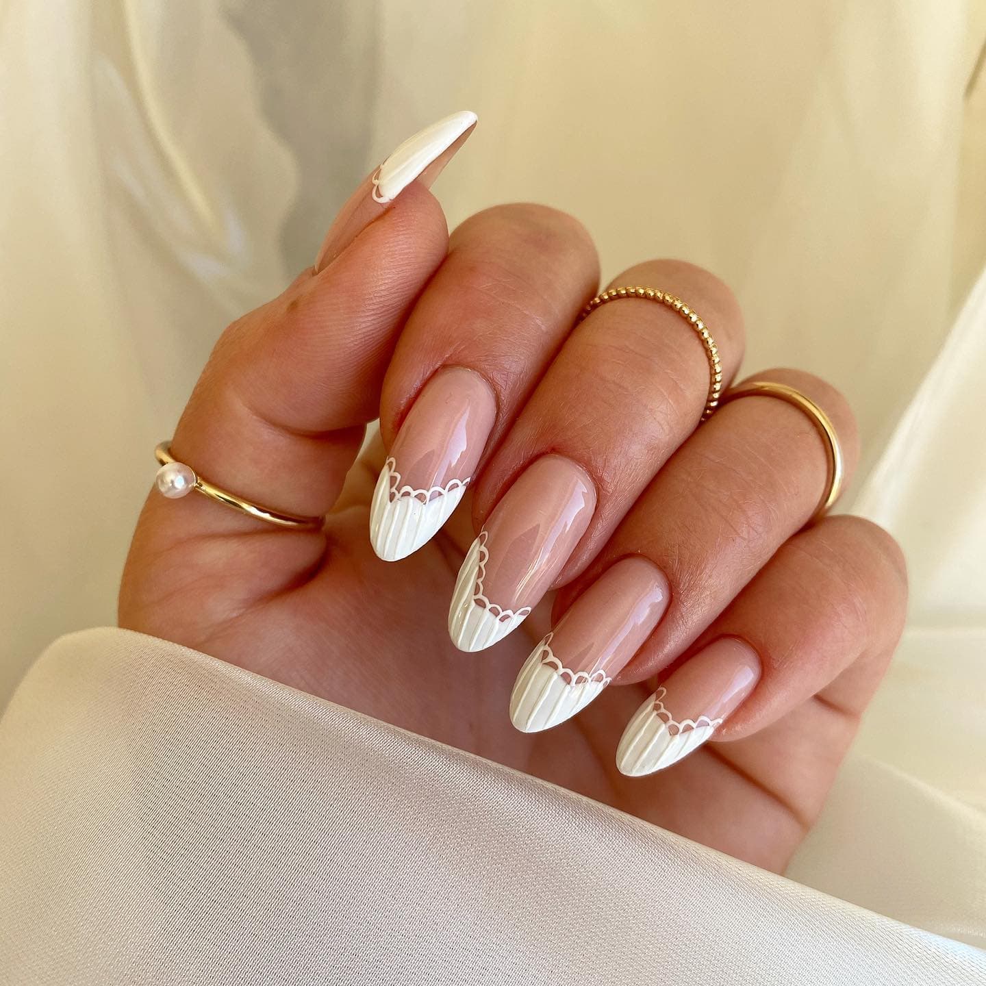 | свадебный френч | Дизайн украшается различными элементами: кружево, вензеля, лепка, стразы, жемчужины, маникюрные ленты и многое другое. |