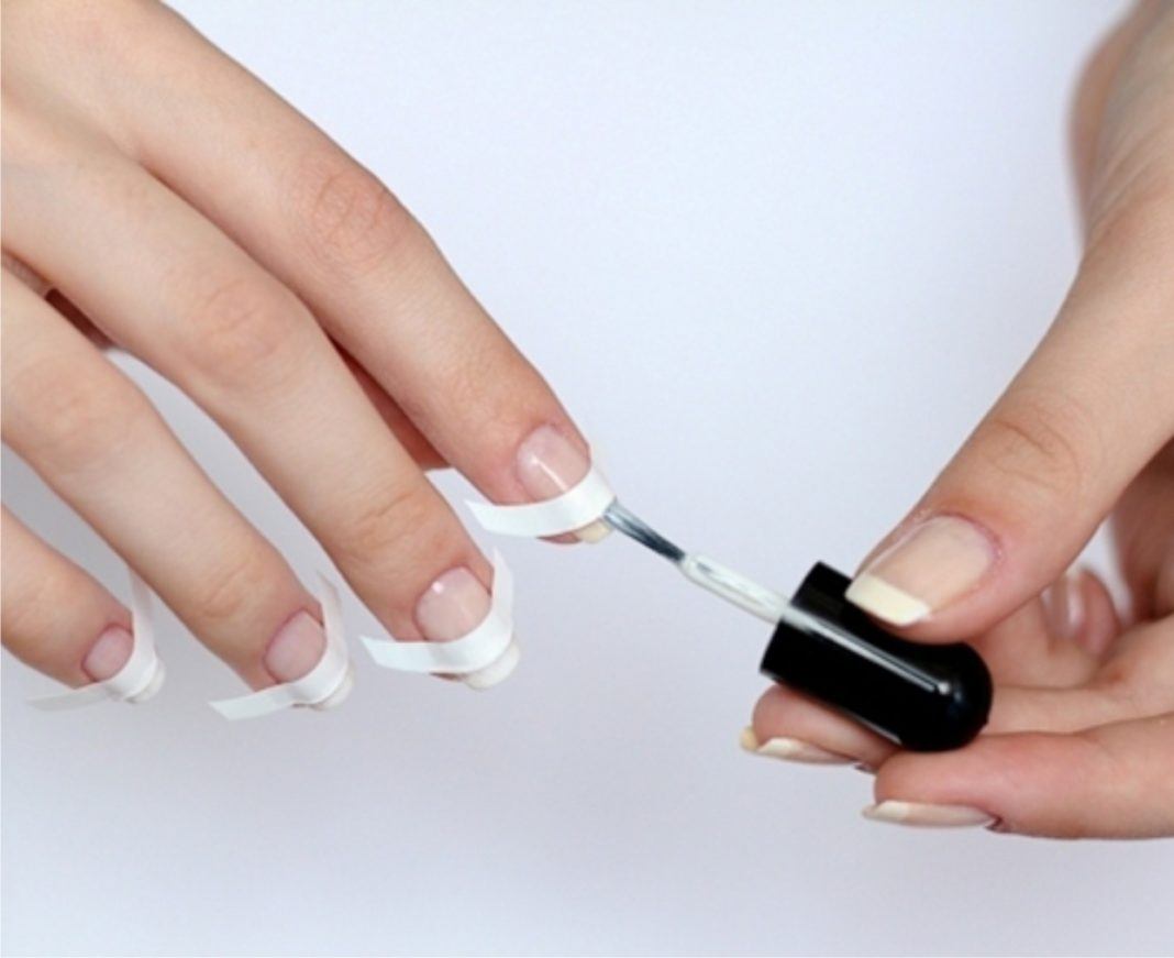 - прекрасной альтернативой полоскам может стать обычный или малярный скотч. Вырежьте из скотча такую полоску, которая вам необходима, и выполните френч обычным способом.