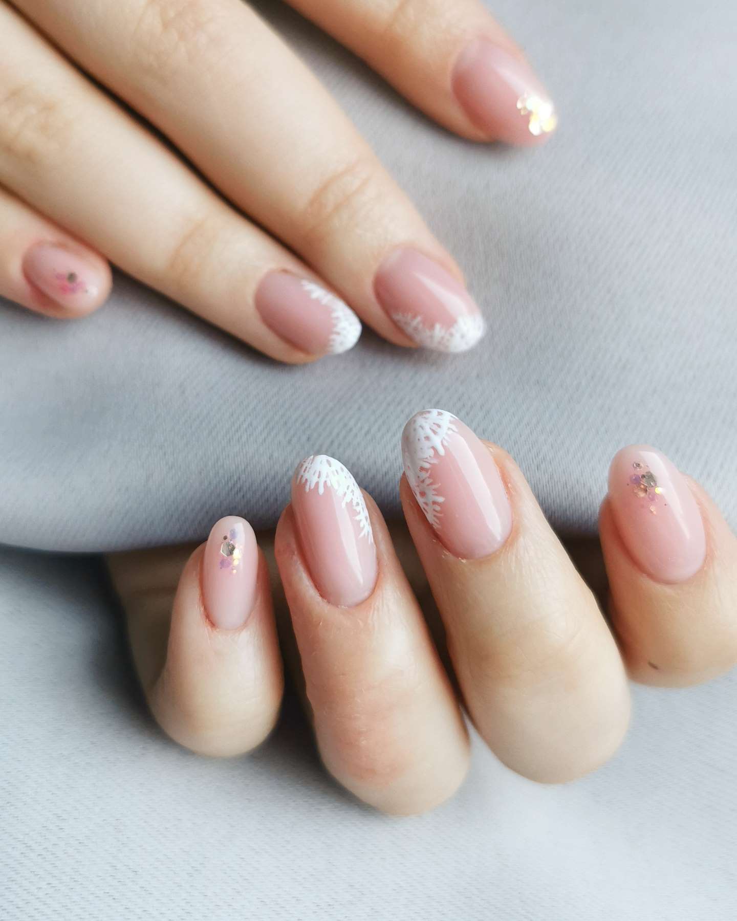 Френч с блестками, маникюр бежевые стилеты