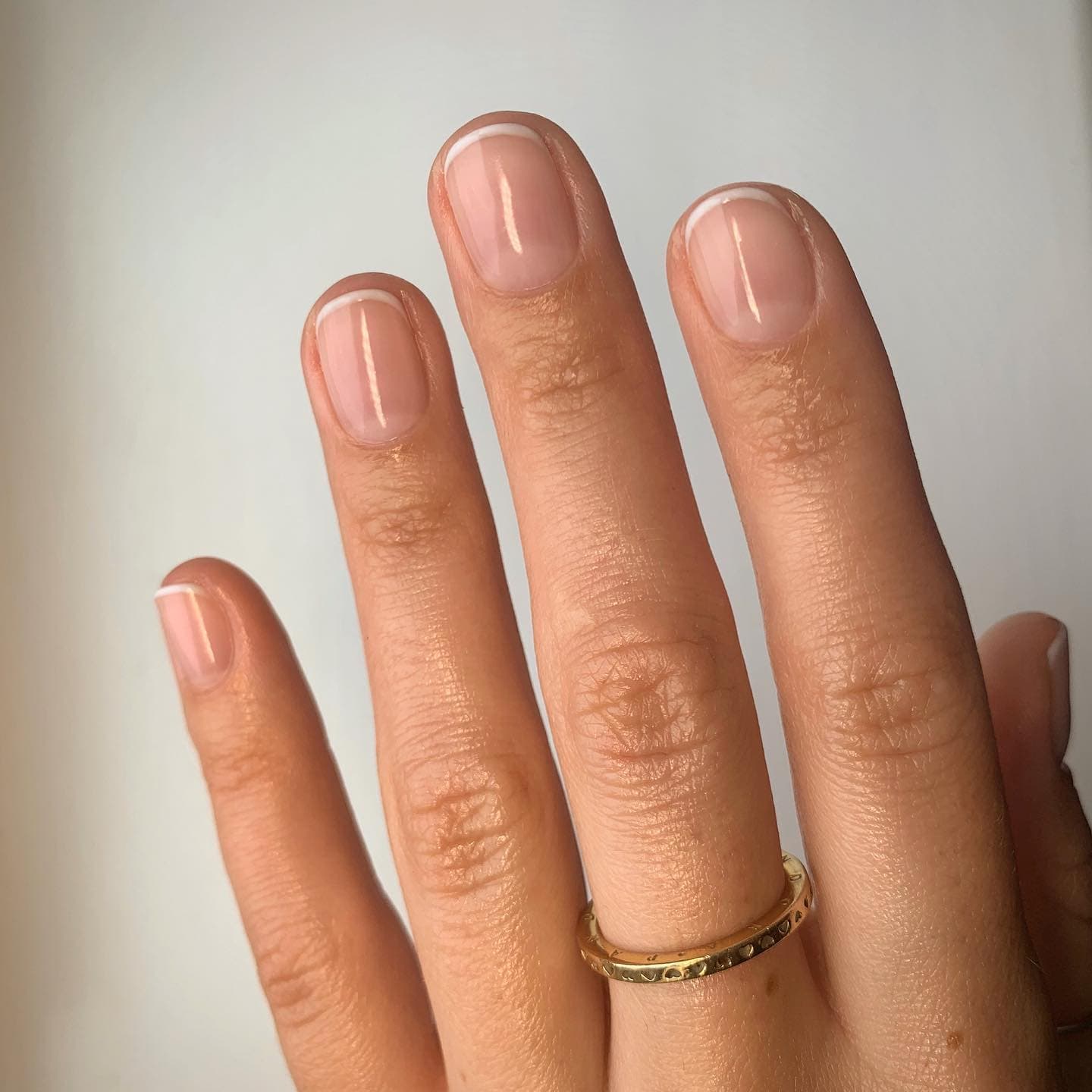 - «Улыбка» должна быть симметричной. Увидеть нюанс нетрудно, если повернуть руку от себя. Это правило пригодится и при создании формы ногтей.