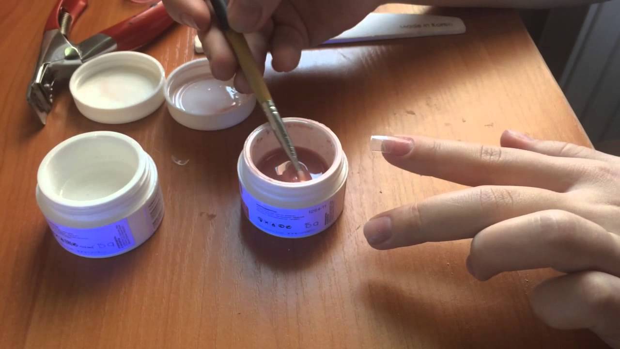 При соприкосновении этих двух компонентов, акрил затвердевает на воздухе, принимая желаемую форму. Именно поэтому его необходимо выкладывать быстро и аккуратно. Это потребует определенного мастерства и сноровки. Начинающим лучше попрактиковаться в выкладке форм из акрила не на руках, чтобы освоить технологический процесс и тонкости работы с материалом.