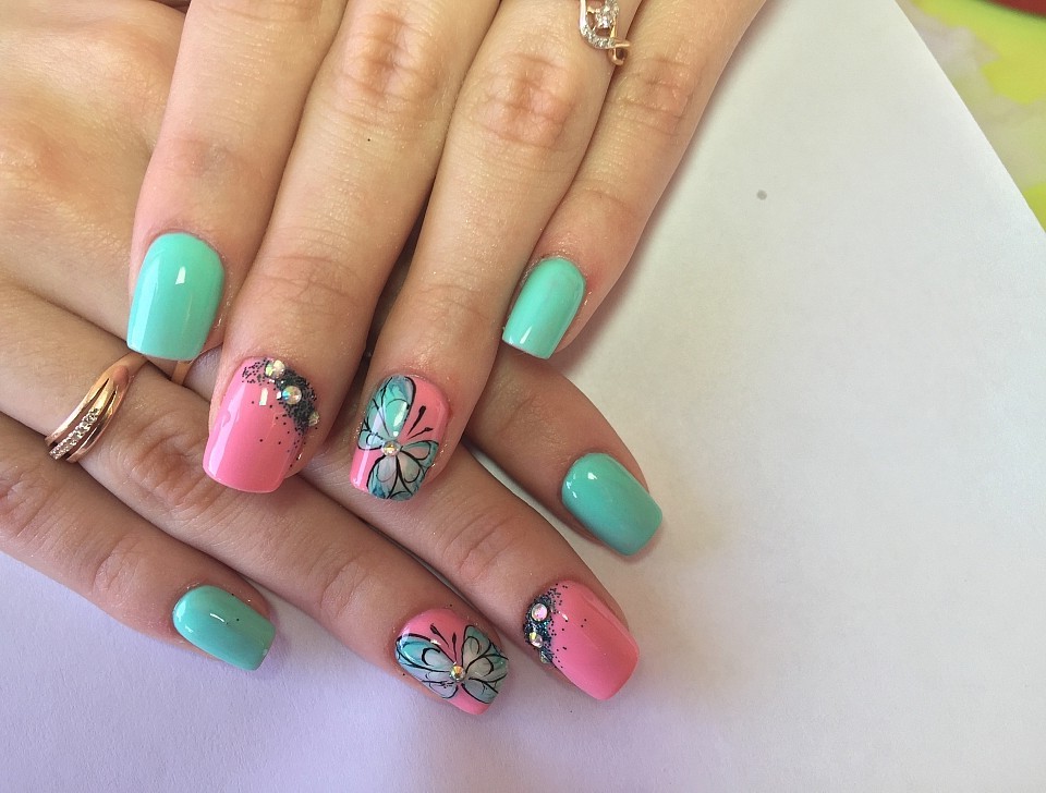 - Рисунки на ногтях могут быть очень разными. Нарисуйте воздушных бабочек на розовом фоне и украсьте их крылышки осколочными блестками мятного цвета, которые будут идеально сочетаться с основным цветом ногтей.