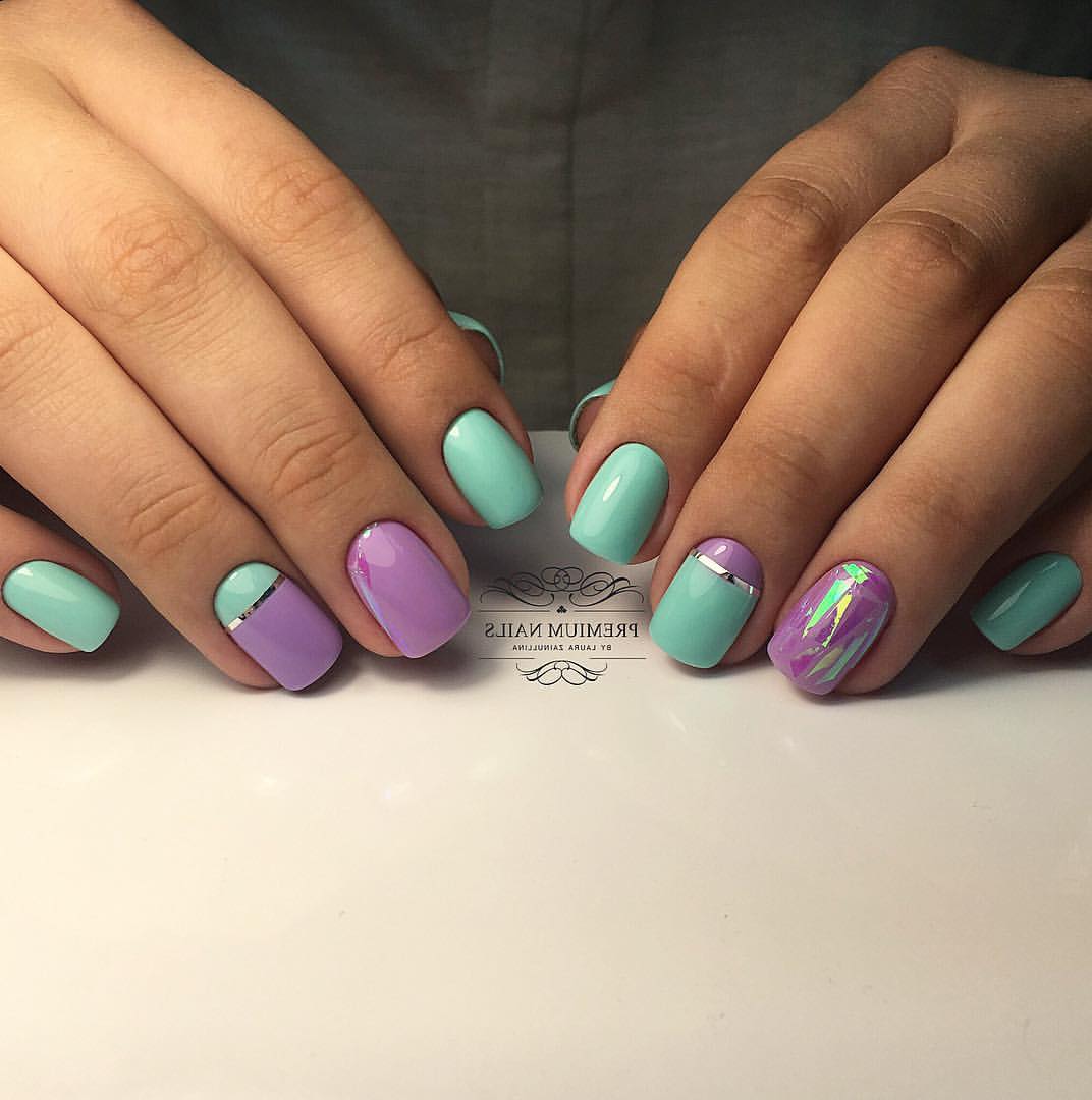- Нежные оттенки эмали мятного и нежного фиолетового оттенка сделают ваш маникюр утонченным и элегантным.