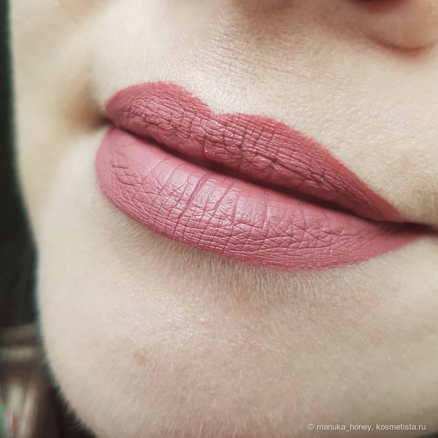 При нанесении на губы ложится ровно, не подчеркивает неровности и не забивается в складки кожи. Здесь стоит отметить, что наносить любые матовые помады стоит на подготовленную, увлажненную кожу губ – например, на полчаса до использования помады нанести на губы бальзам, а перед самим нанесением убрать остатки салфеткой, или воспользоваться патчем/тканевой маской для губ.