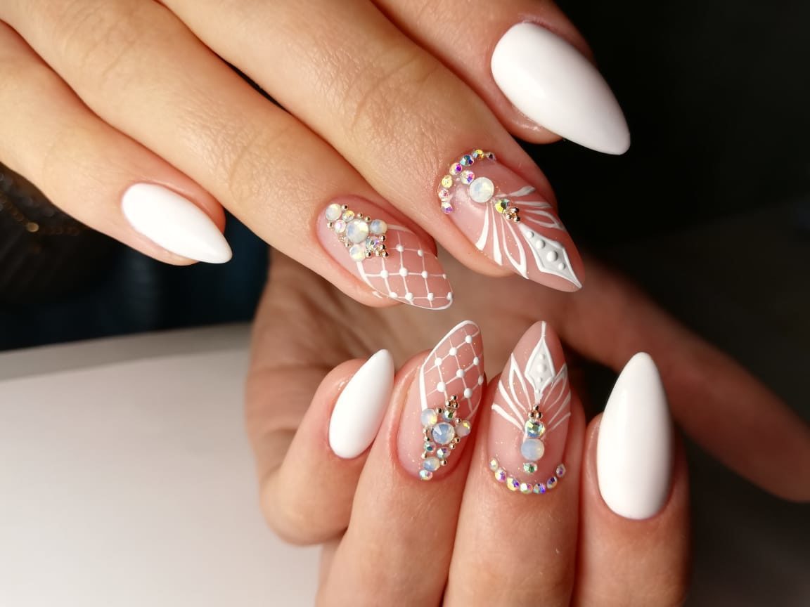 Молочный оттенок не так прост, как может показаться сначала. Это тот цвет, который может меняться в зависимости от освещения. Такую необычную особенность мастера нейл-дизайна отлично обыгрывают серебряными и золотыми нотками. Превосходный пример такой идеи – молочный френч с золотой фольгой. Этот маникюр универсален, подойдёт как к вашему деловому костюму, так и к праздничному платью.