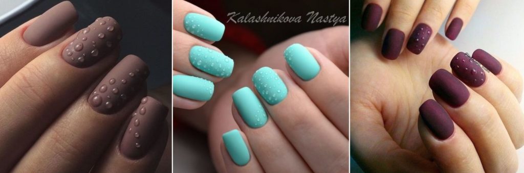 Шикарно смотрятся на неблестящем фоне глянцевые капли. Создается впечатление, что с пальцев не успела стечь вода. Свежее и оригинальное решение.