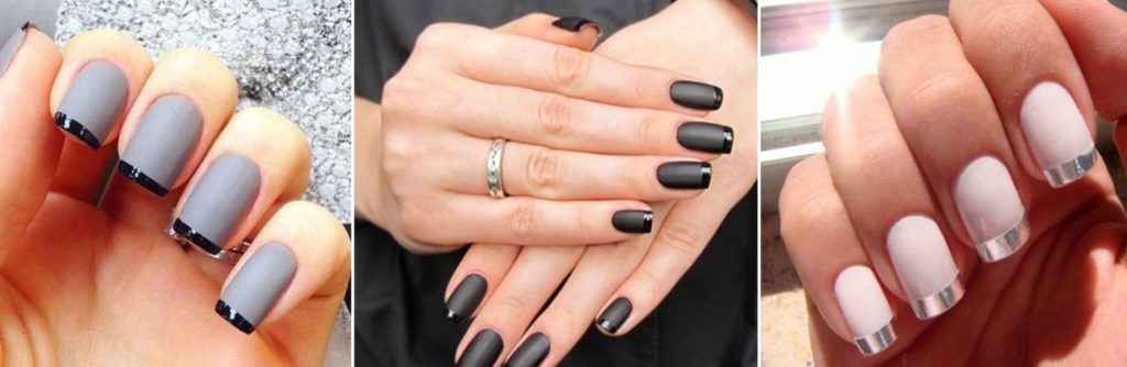 Разнообразные дизайны гелевого matte покрытия в черных цветах не перестают удивлять. Необычное выражение классического лунного маникюра представлено на фото. Вместо изогнутой линии нанесена прямая. Также присутствует дополнительная линия, обрамляющая основание ногтя, подчеркивающая изгибы.