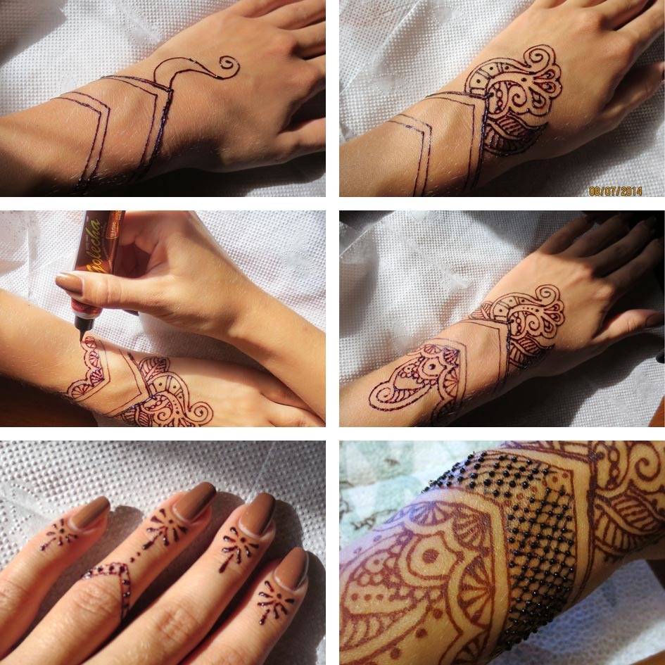 Мехенди для начинающих, особенно не умеющих рисовать, может показаться сложным делом. Чтобы рисунок получался ровным, нужно немного потренироваться на бумаге, а во время работы иметь перед глазами пример нужного орнамента. Делать эскиз на коже нельзя – краска не сможет впитаться в через другой пигмент.