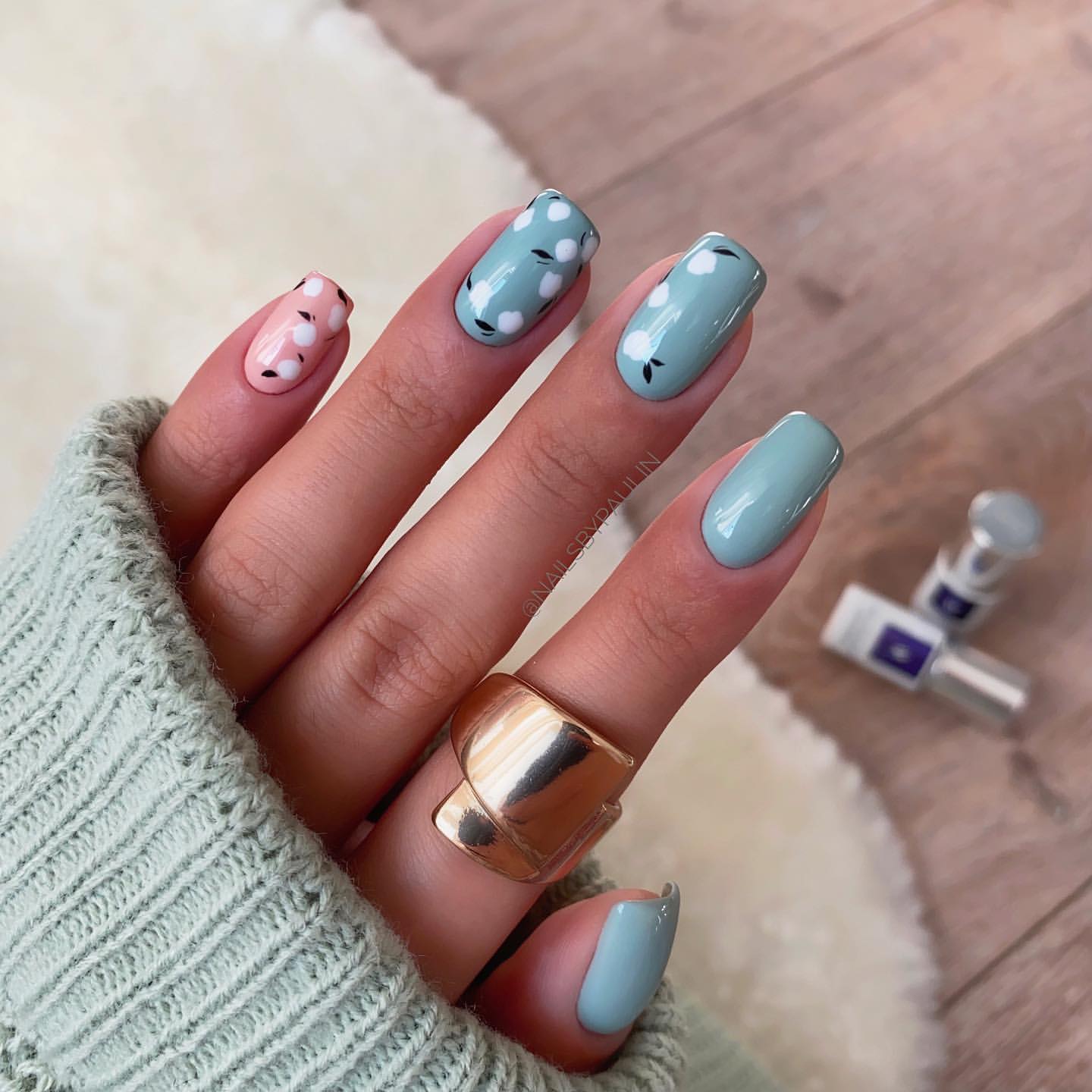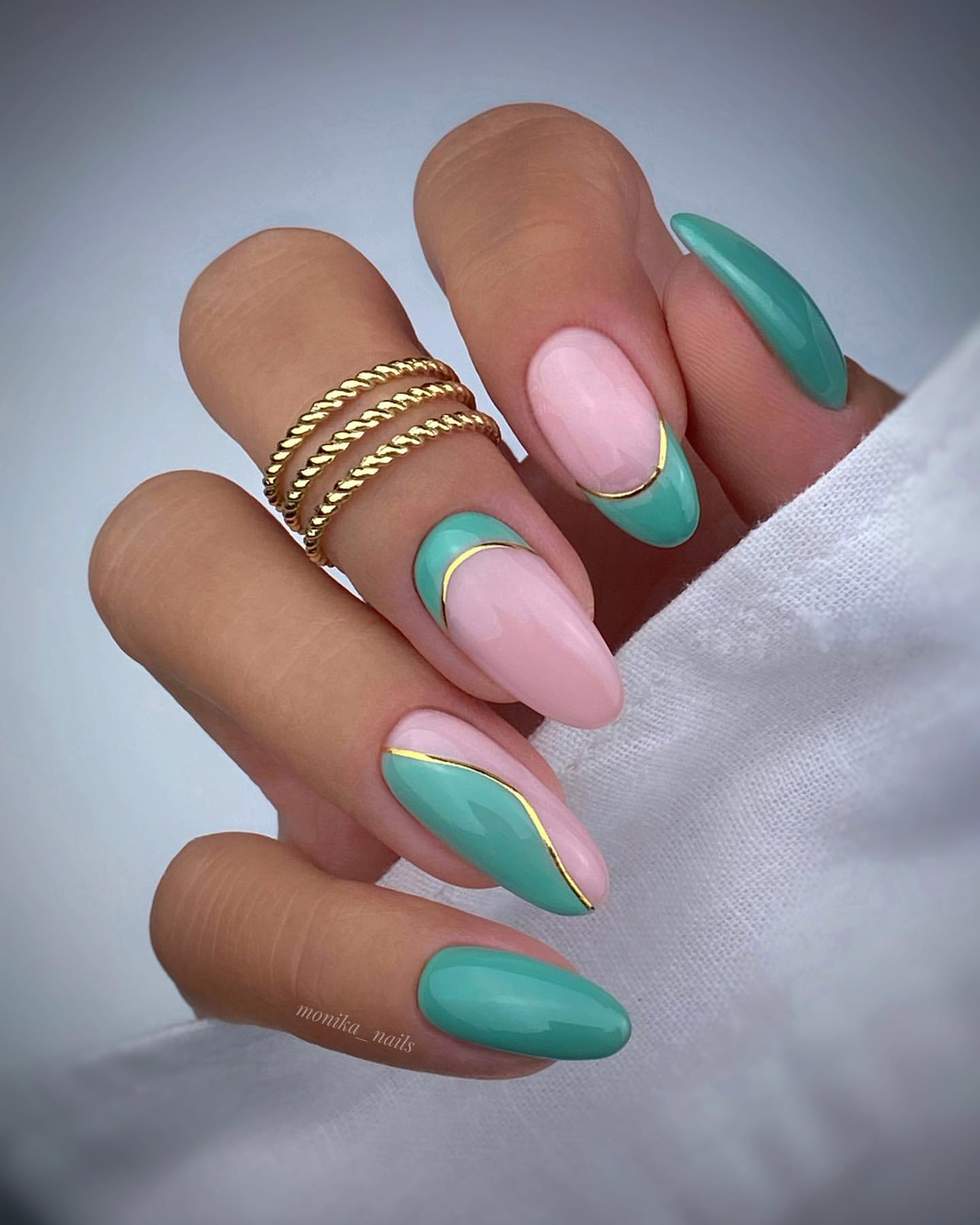 - к пастельному маникюру удачно подходит золотой геометрический дизайн;nailsbyhannacecilia