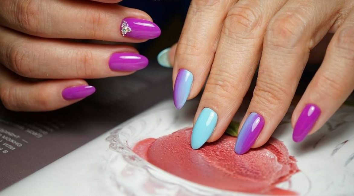 - Переходы от темного цвета к более светлому оттенку или наоборот, такую технику еще называют омбре в маникюре;