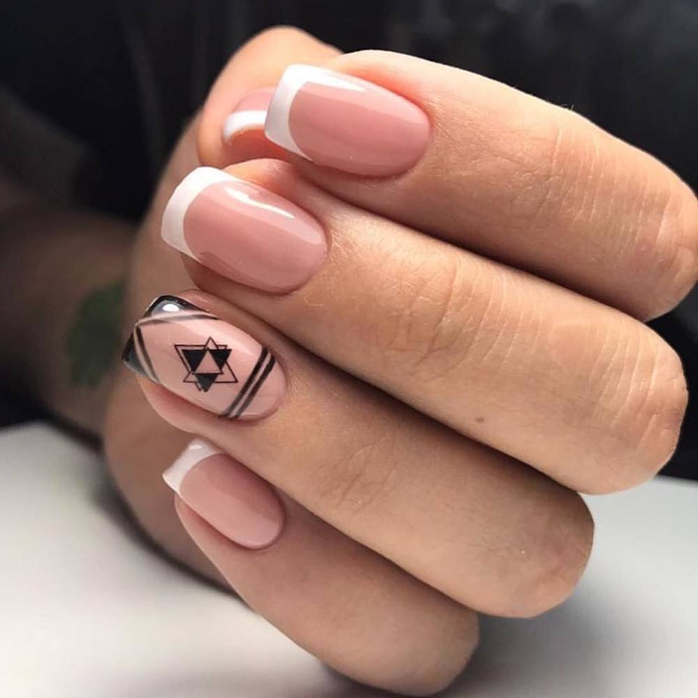 Как уже говорилось выше, классический френч – это база, поэтому можно смело дополнять ее различными рисунками. К примеру, геометрический дизайн часто бывает насыщенным, дерзким. В данном случае это неприемлемо, ведь намного более интересно будут смотреться легкие минималистичные линии или фигуры. Такое сочетание – прекрасное решение даже для повседневной жизни.