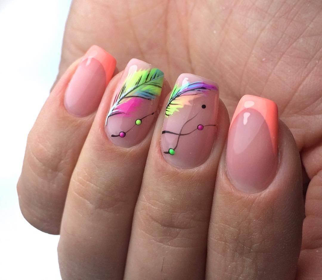В летний сезон цветной нейл-арт является наиболее популярным среди всех остальных. Как вариант, обычную белую улыбку можно продублировать тонкой цветной линией. Для таких манипуляций вам могут понадобиться тонкие кисти. Можно украшать рисунками, сделанными благодаря стемпингу; нарисованными цветами или геометрическими фигурами(узорами).