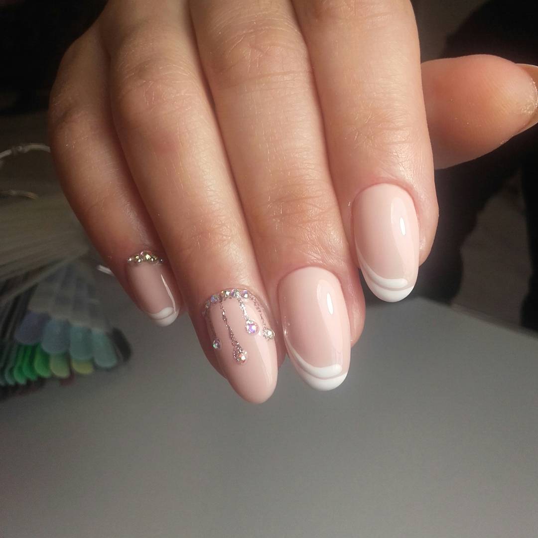 Мастера маникюра часто на такие случаи предлагают французский маникюр в нежно-розовых оттенках и с небольшими элементами декора. К примеру, маленькое сердечко в уголке ногтевой пластины безымянного пальца. Данный маникюр выглядит аккуратно и немного кокетливо.