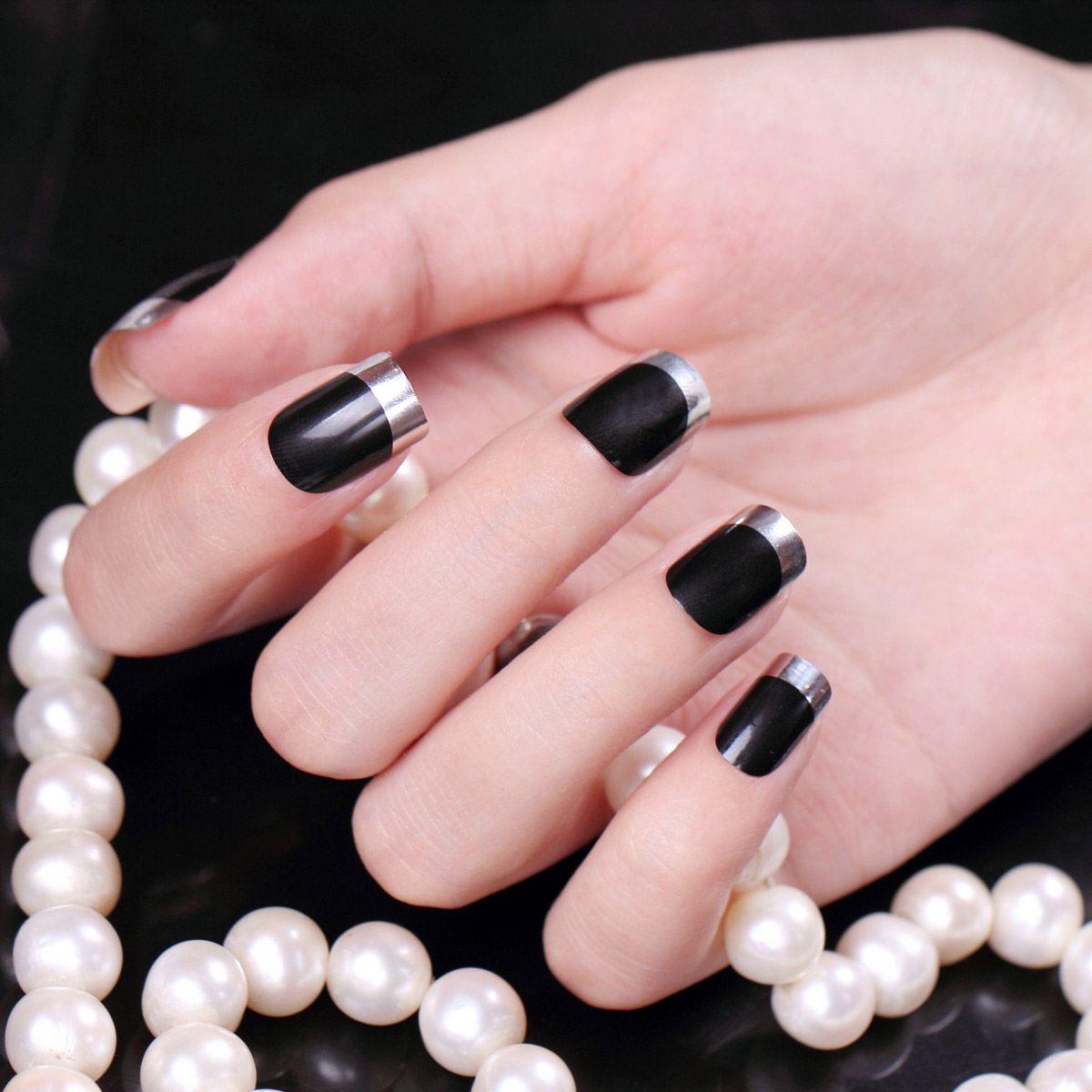Модницам быстро надоедает классика. Хочется чего-то яркого, но при этом такого же благородного, как и бело-розовый френч. Отличный вариант, который будет уместен на торжественном событии, — микс черного или бордового оттенков с золотом или серебром. Это роскошное сочетание. Девушка с красивыми длинными пальцами и таким маникюром станет невероятно притягательным объектом для сильного пола.