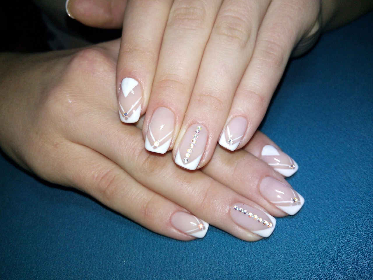 Вооружаемся лаками белого, а также розового или бежевого цветов. Понадобится и прозрачный финиш. Далее техники разнятся.