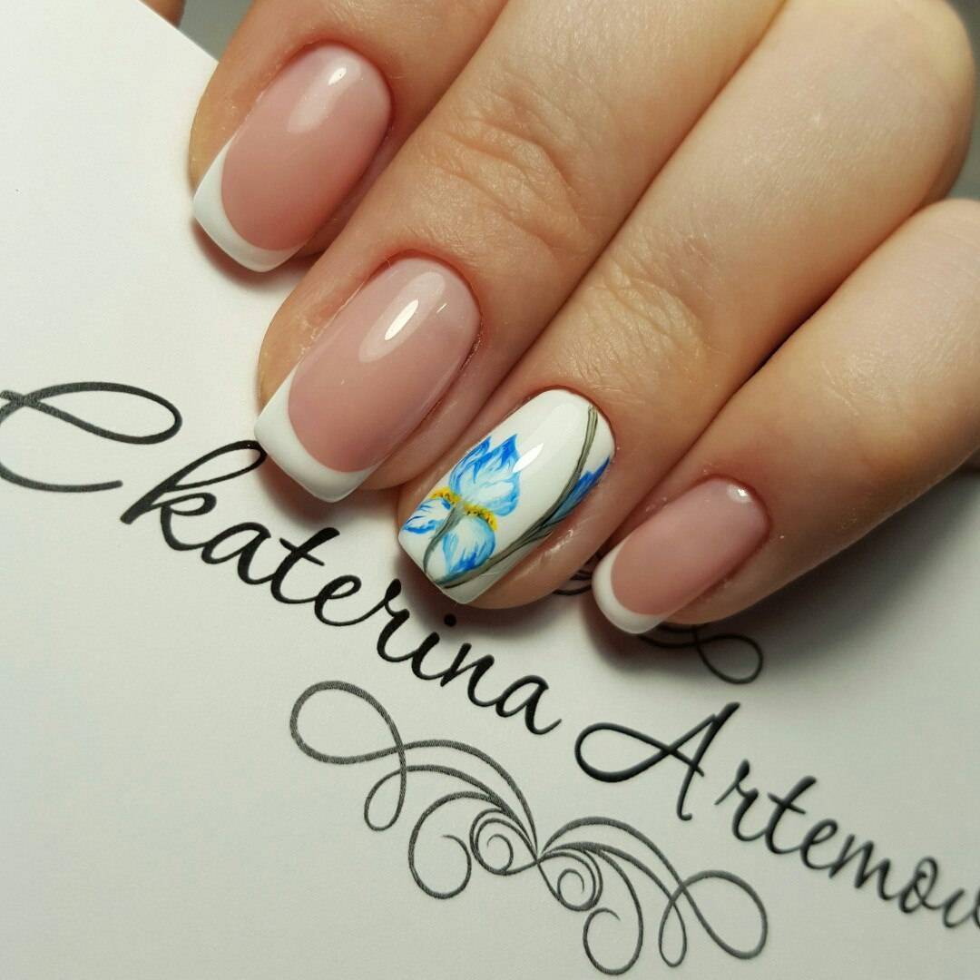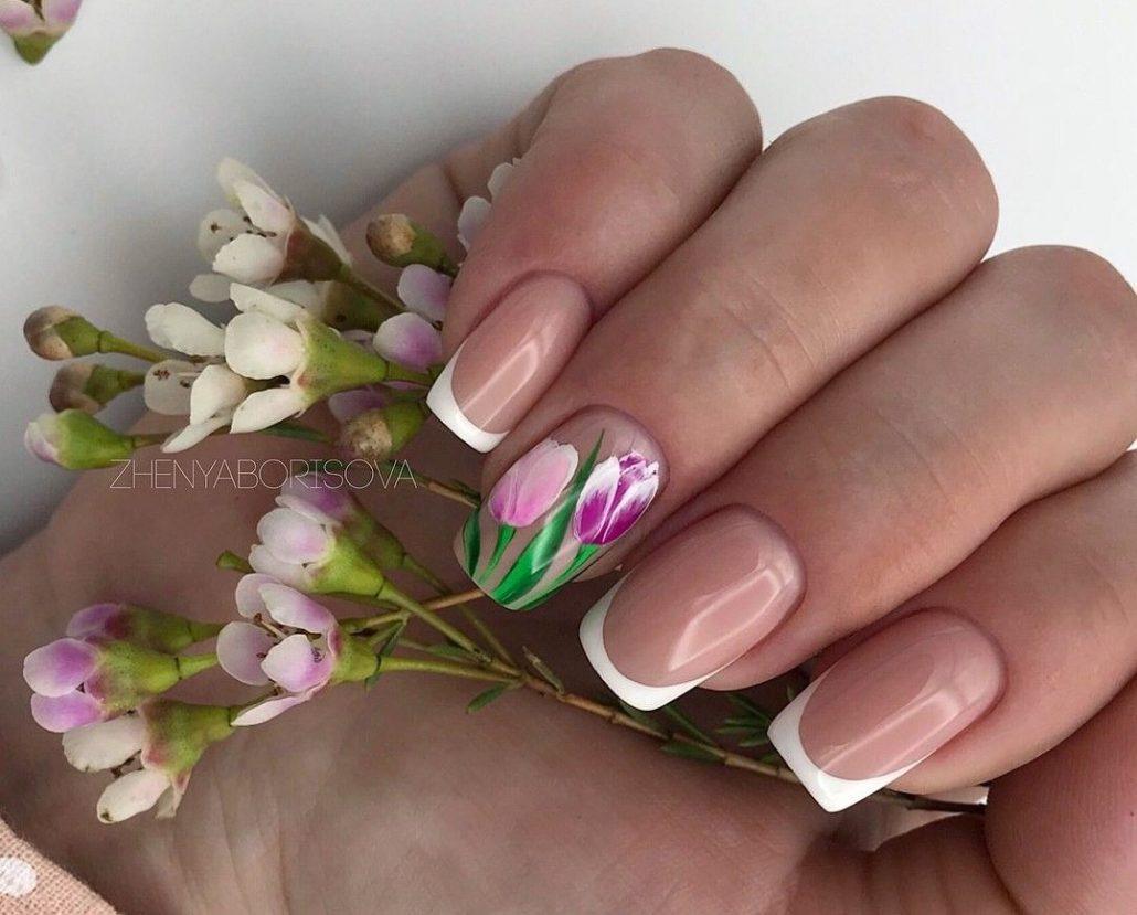 Для весеннего маникюра характерна цветочная тематика, нежные, но яркие оттенки. Весенний френч можно выполнить белым, оранжевым, лимонным, изумрудным цветами и дополнить его флористикой на безымянном пальце.