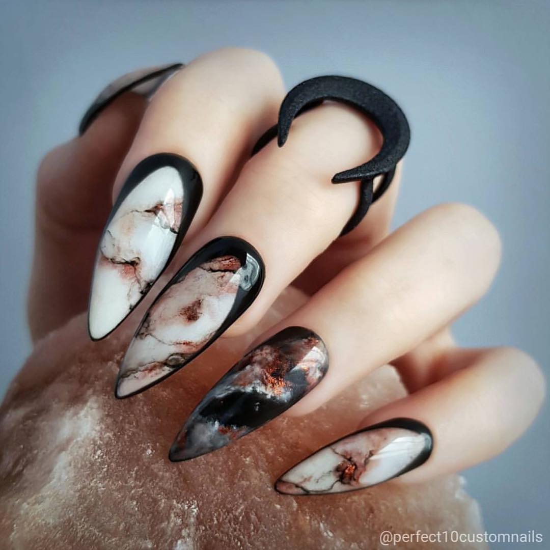 Этот визуальный эффект пригодится тем, у кого ногти сами по себе маленькие, даже если не подстригать их «под корень». Им стоит делать мраморный маникюр с белым фоном и черными прожилками.