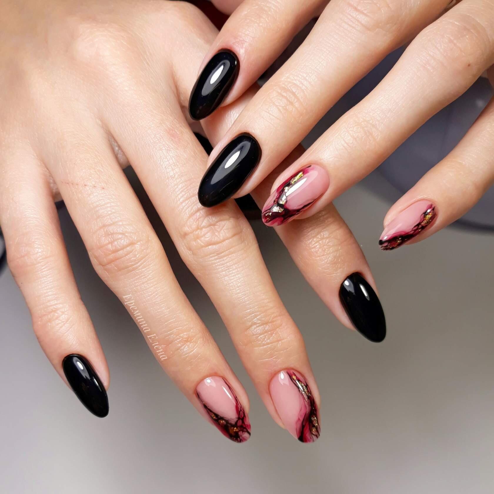 Такой маникюр сейчас очень актуален для поклонниц тёмных оттенков на ногтях.