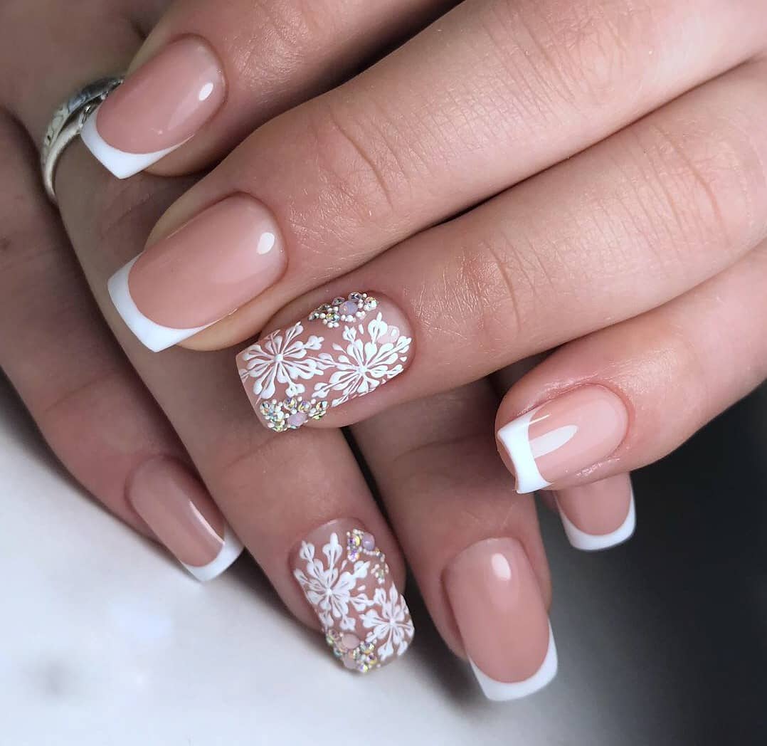 Он всегда смотрится привлекательно, независимо от времени года и дополнительного украшения. Именно поэтому его выбирают многие невесты для столь долгожданного праздничного дня. Конечно же, в данном случае заранее стоит обговорить все нюансы, чтобы в день свадьбы все прошло идеально. Чаще всего линию улыбки оформляют белым цветом и лишь на нескольких ноготках допустимо наносить рисунки. Это могут быть кружевные вставки, абстракция или же цветочный принт. В сочетании со стразами такой маникюр будет выглядеть потрясающе красиво.