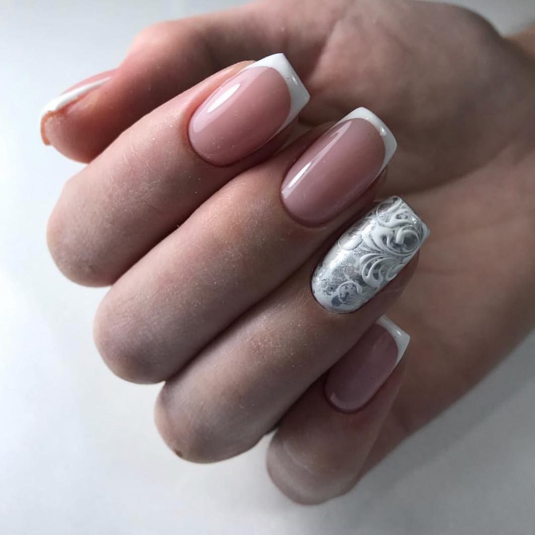 Дополнить французский маникюр можно рисунками на одном или нескольких ноготках, стазами, блестками или глиттером. Тау можно смело проявлять фантазию и творческие навыки.