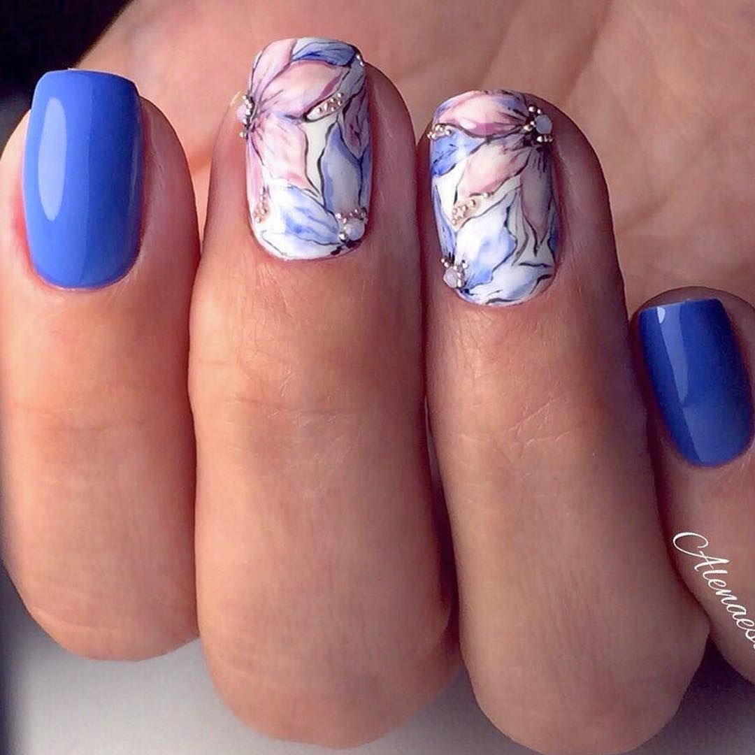 Также очень красиво синий маникюр выглядит, если дополнить его декором из россыпи страз.