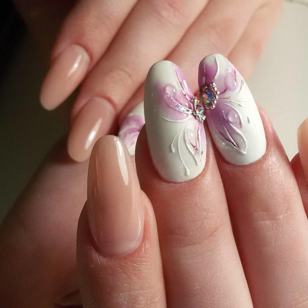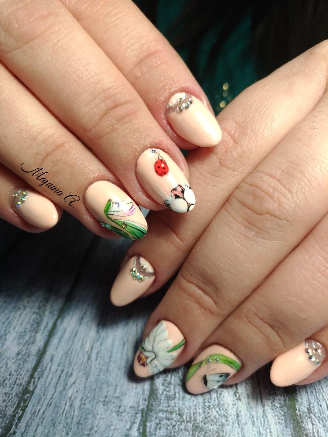 Нежными выступают полупрозрачные нюды и клубнично-сливочные цвета. Дополните их белыми или блестящими вставками в виде рисунков, точек, камифубиков.