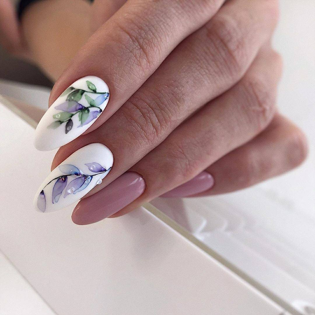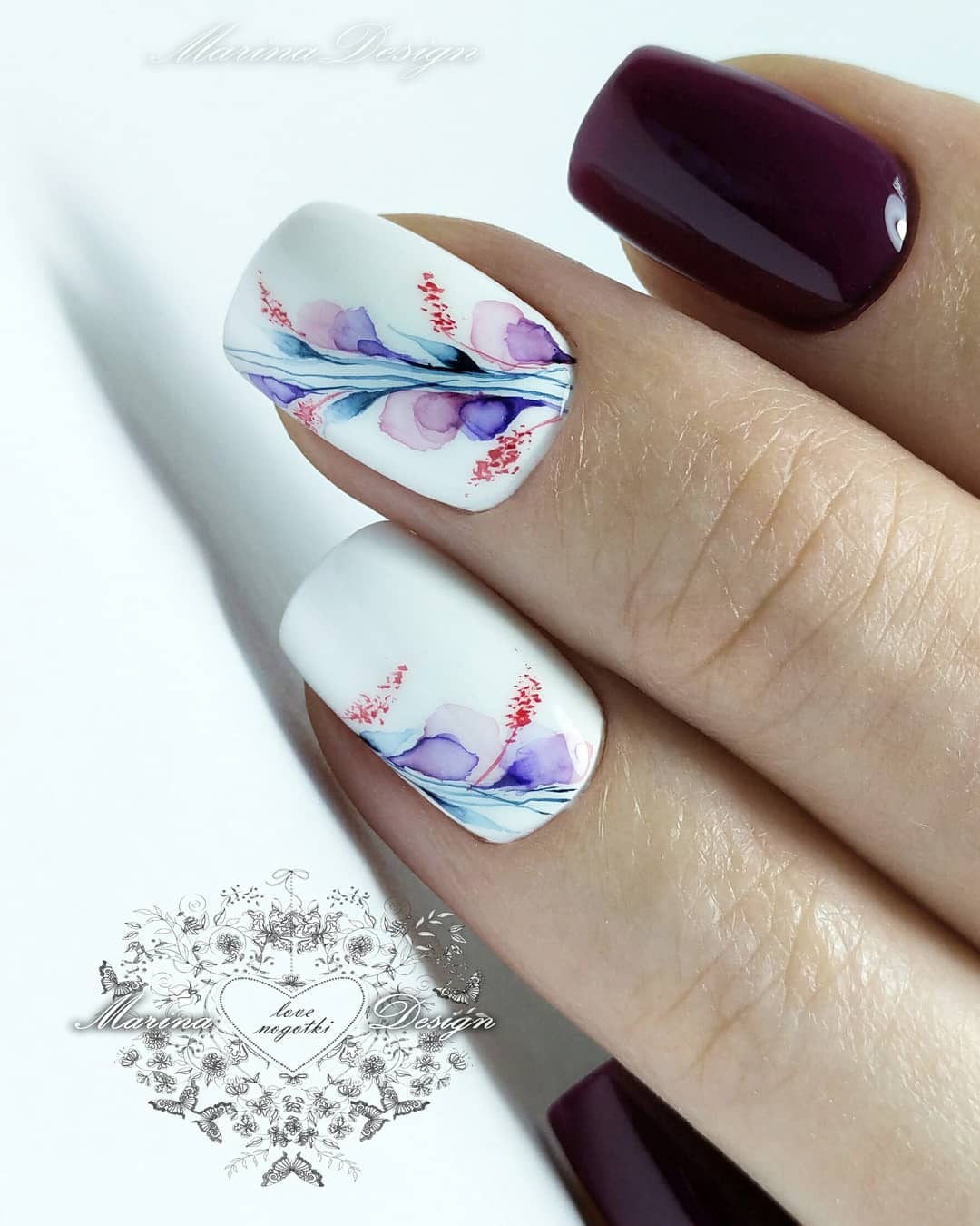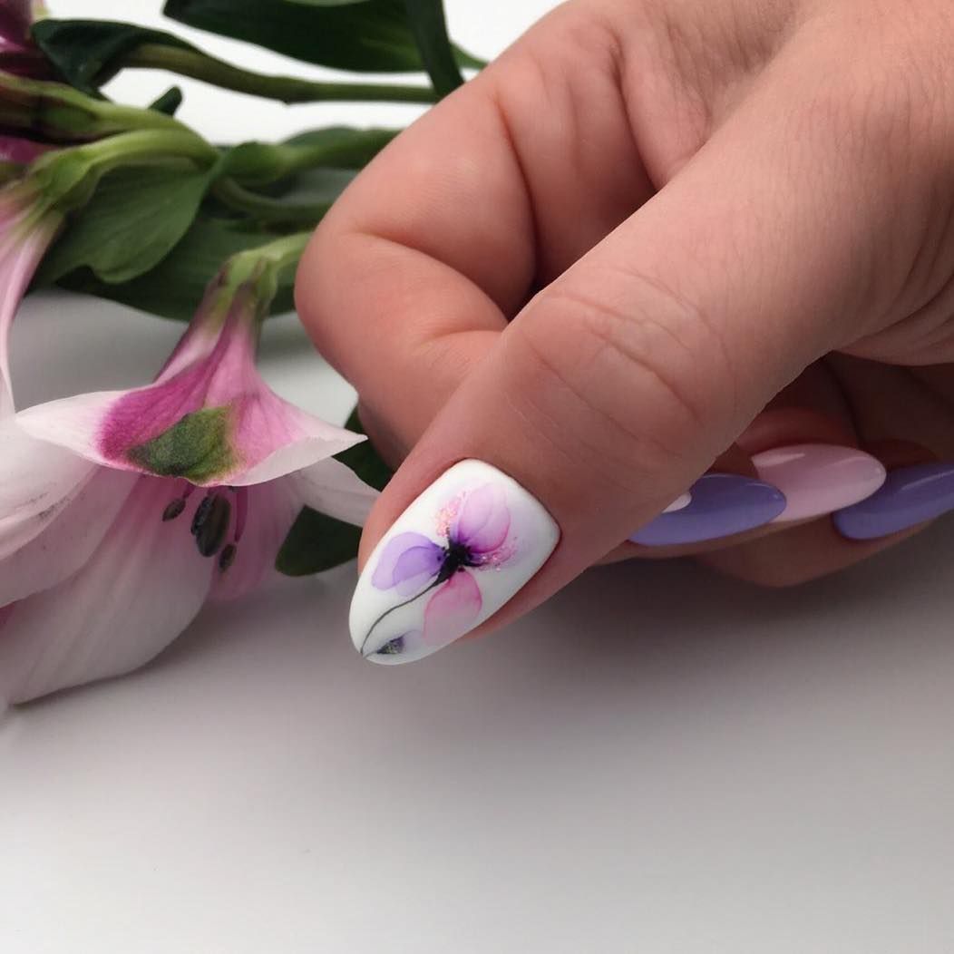Работать с акварелью умеют не все мастера, поэтому если вы решили выполнить такой дизайн, заранее поинтересуйтесь у мастера о его опыте. Акварельный маникюр выполняется в светлых тонах, главным из которых является белый. На белом фоне цветы смотрятся очень мягко и сдержанно. Для изображения цветов используется фиолетовый и розовый цвета с многочисленными полутонами.