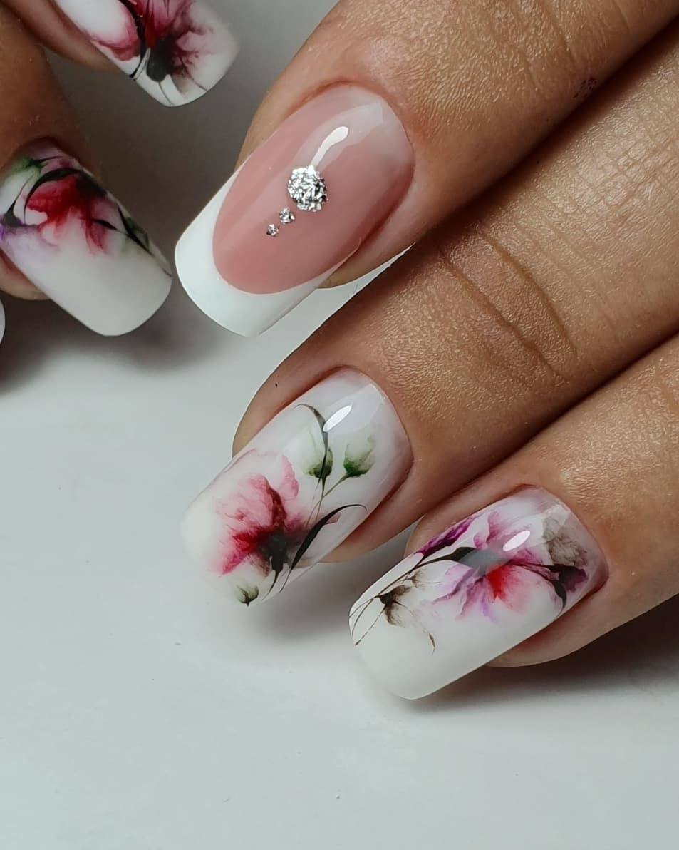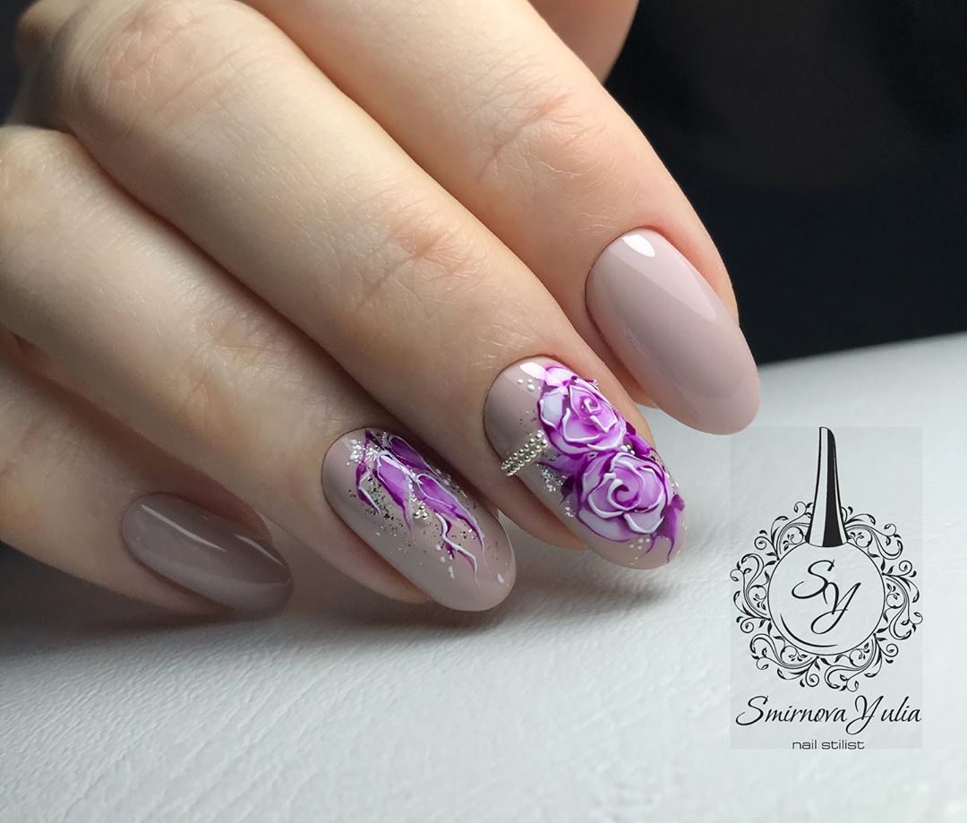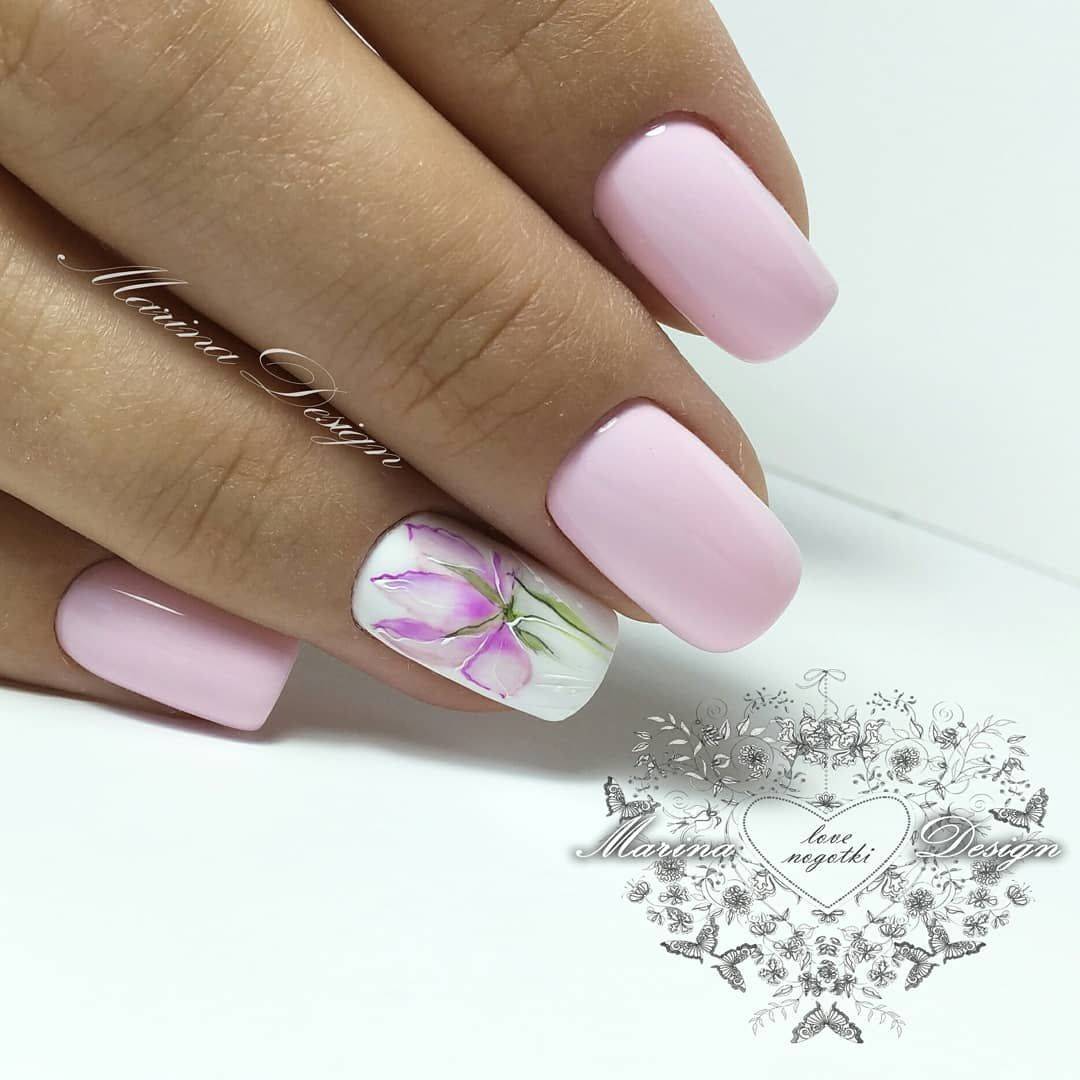 Работать с акварелью умеют не все мастера, поэтому если вы решили выполнить такой дизайн, заранее поинтересуйтесь у мастера о его опыте. Акварельный маникюр выполняется в светлых тонах, главным из которых является белый. На белом фоне цветы смотрятся очень мягко и сдержанно. Для изображения цветов используется фиолетовый и розовый цвета с многочисленными полутонами.