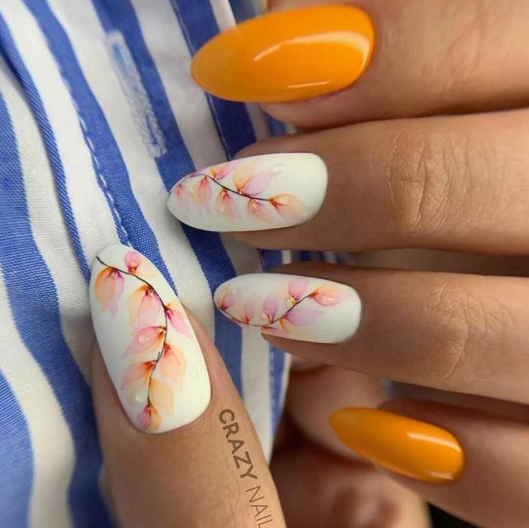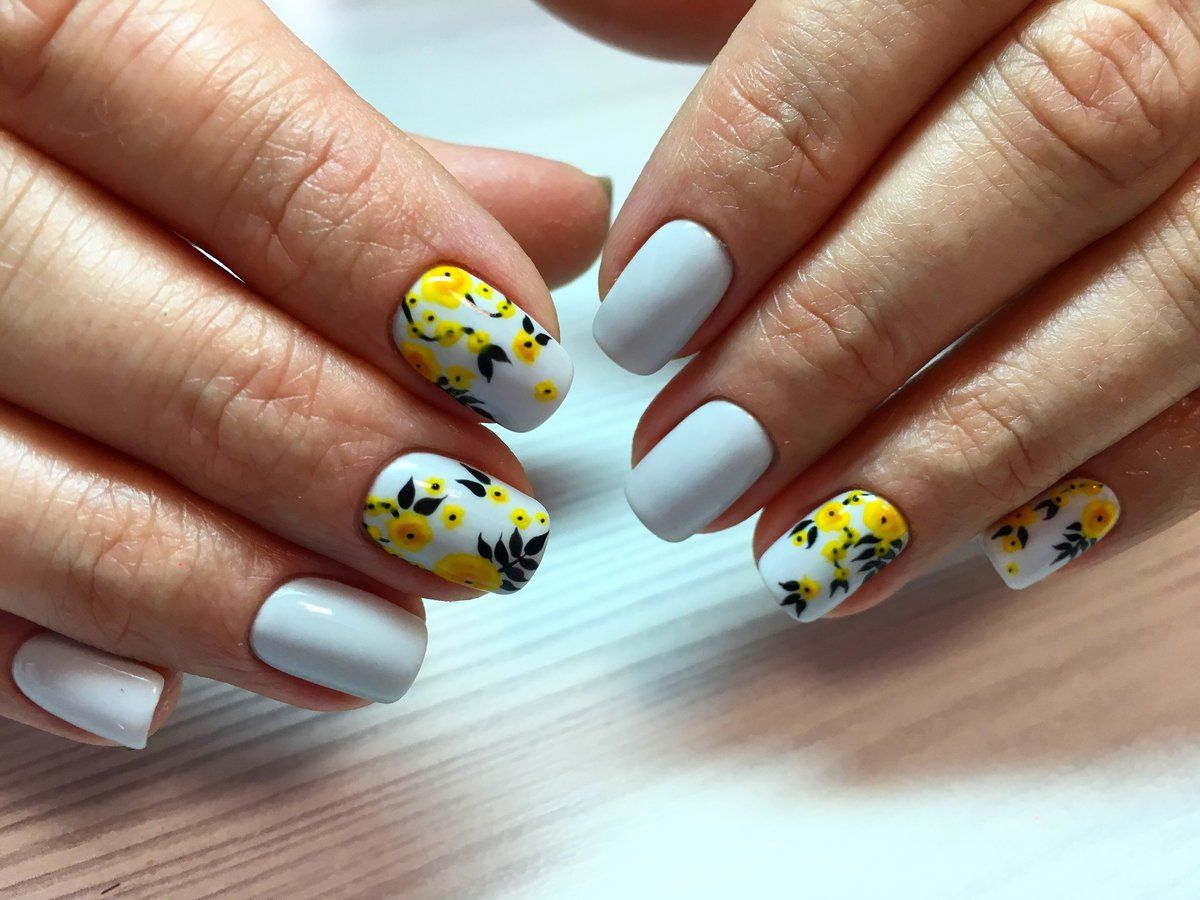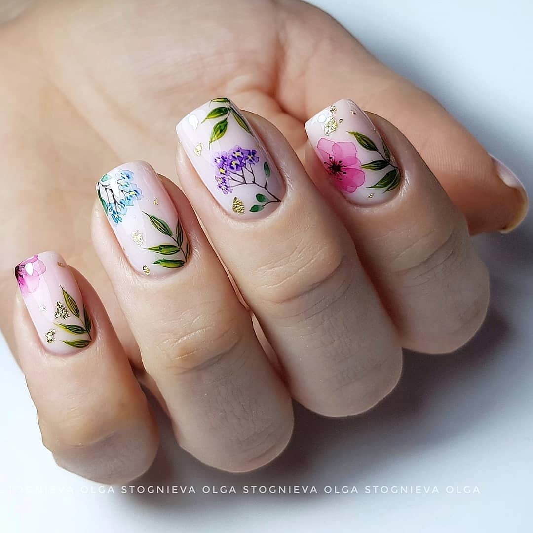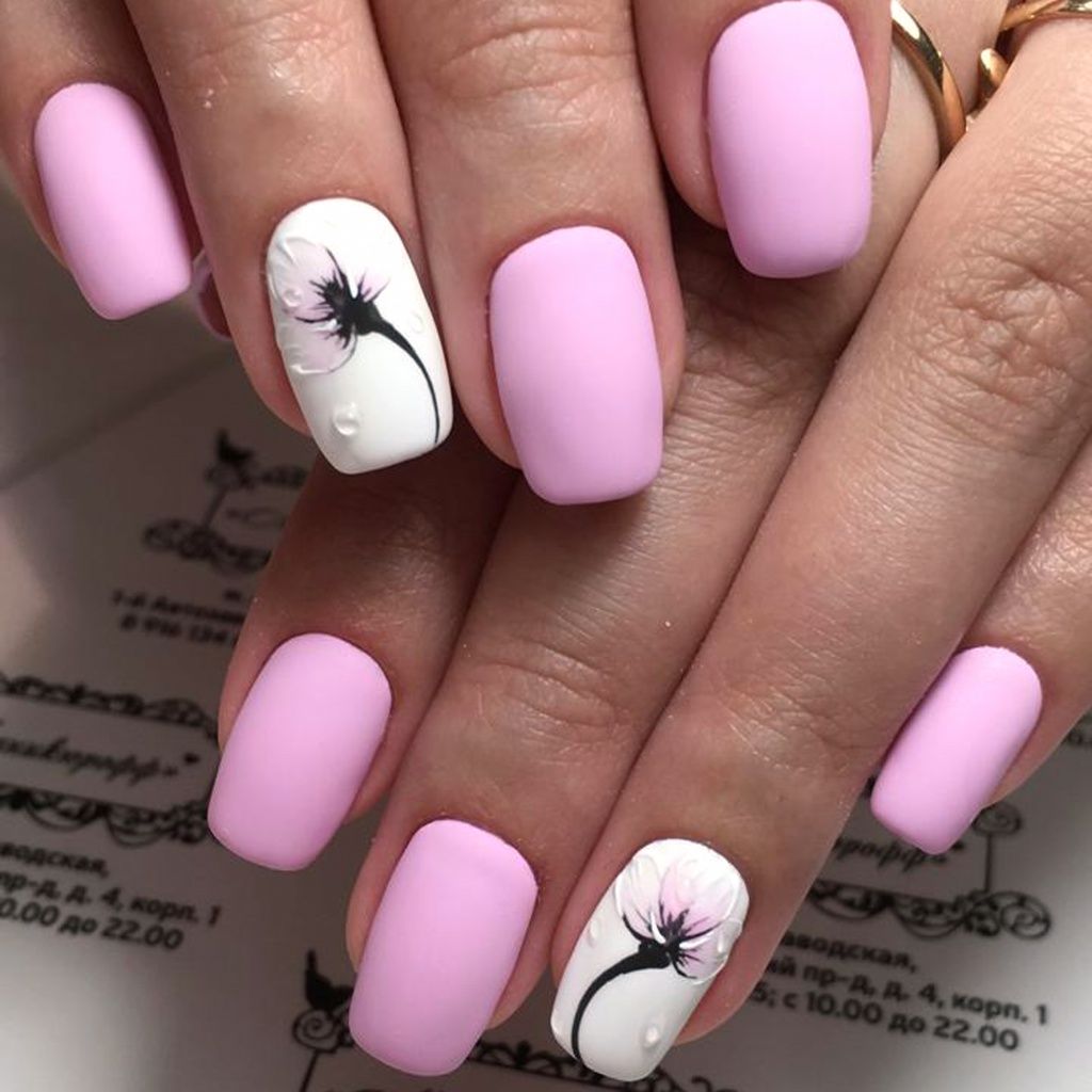 Полевые цветы смотрятся на ногтях очень нежно и легко. Воздушные лепестки и бутоны отлично гармонируют со светлым фоном, с матовой текстурой, с яркими тонами, например, фиолетовым или оранжевым.