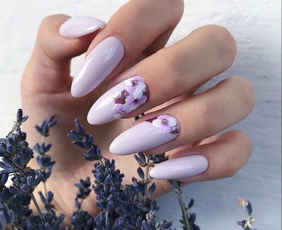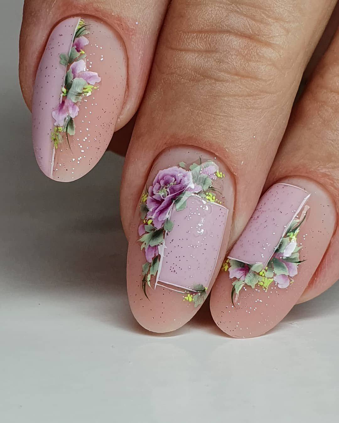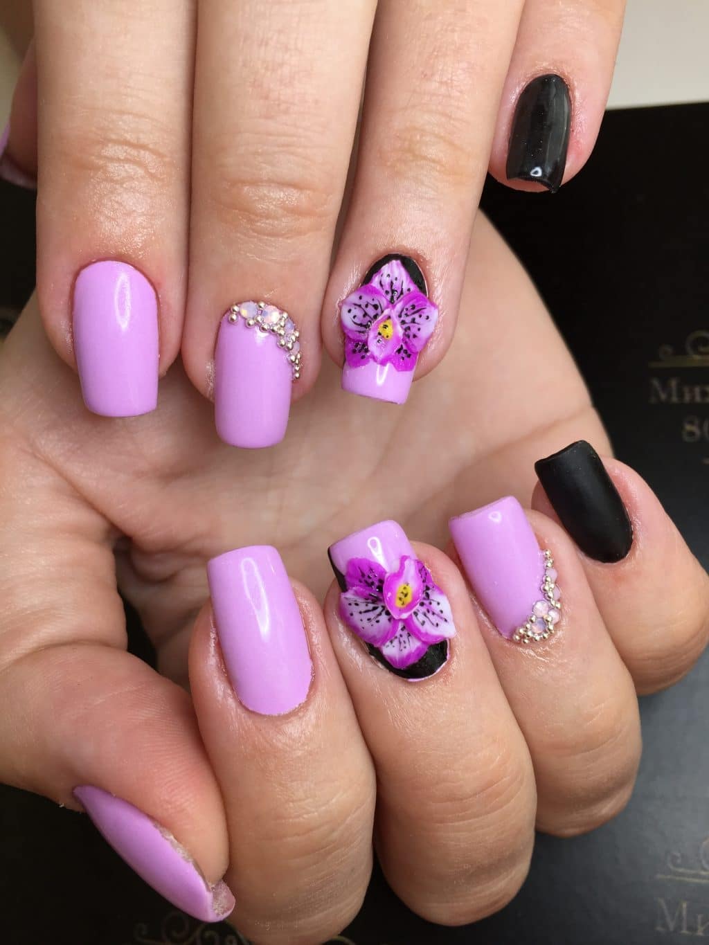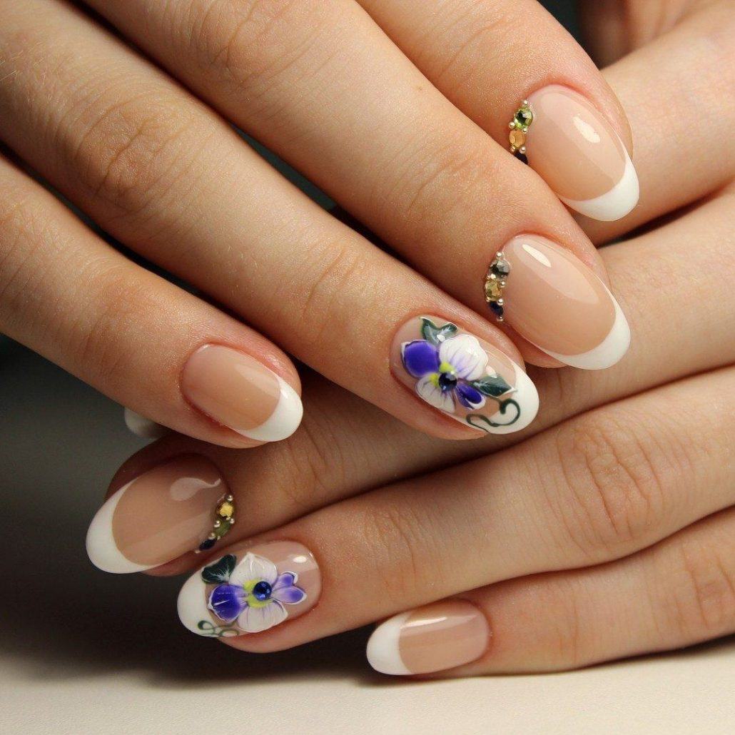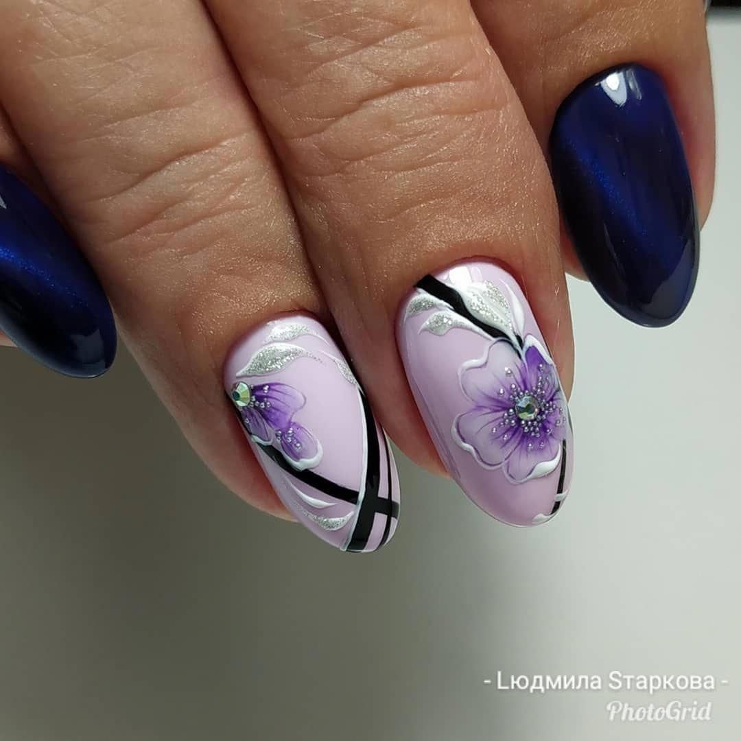 Полевые цветы смотрятся на ногтях очень нежно и легко. Воздушные лепестки и бутоны отлично гармонируют со светлым фоном, с матовой текстурой, с яркими тонами, например, фиолетовым или оранжевым.