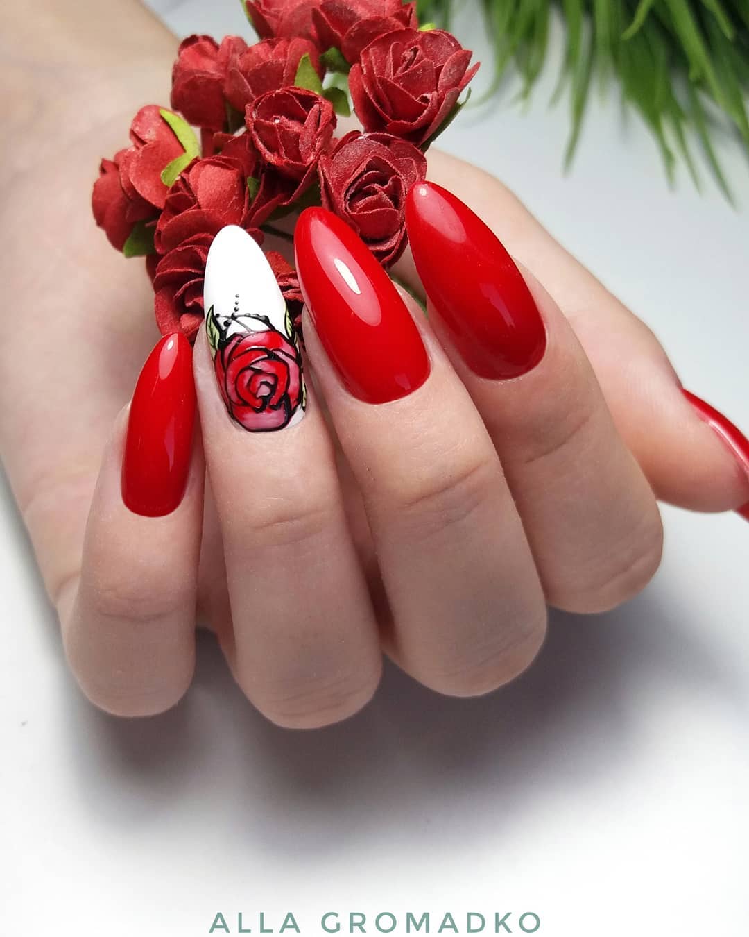 Стильный френч на красном фоне невероятно популярен среди модниц. При однотонном выполнении алого маникюра дизайн ноготков будет выглядеть агрессивно, но если совместить его с классическим французским маникюром, он теряет всю дерзость и приобретает прекрасный внешний вид. Нежная улыбочка на кончике ноготка придаст дизайну сдержанности и умиротворенности. Выполняя черный френч на строгой красной основе, девушка может смело сочетать его с деловым дресс-кодом. Не обязательно применять красный цвет в качестве основы, она может быть выполнена нюдовым оттенком, при этом красная улыбка придаст дизайну элегантности и женственности. Такой маникюр в минималистском стиле подойдет под романтические и нежные образы.