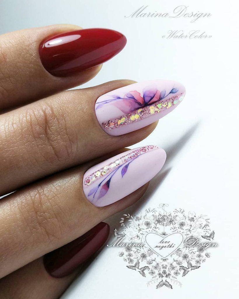 Темно-розовые оттенки это бордово-розовый, пепельно-розовый, грязно-розовый и коричнево-розовый. Такие цвета частый выбор любительниц розового в зимний период. Для такого маникюра подойдут черные рисунки с четкими линиями, втирка и матовая текстура.