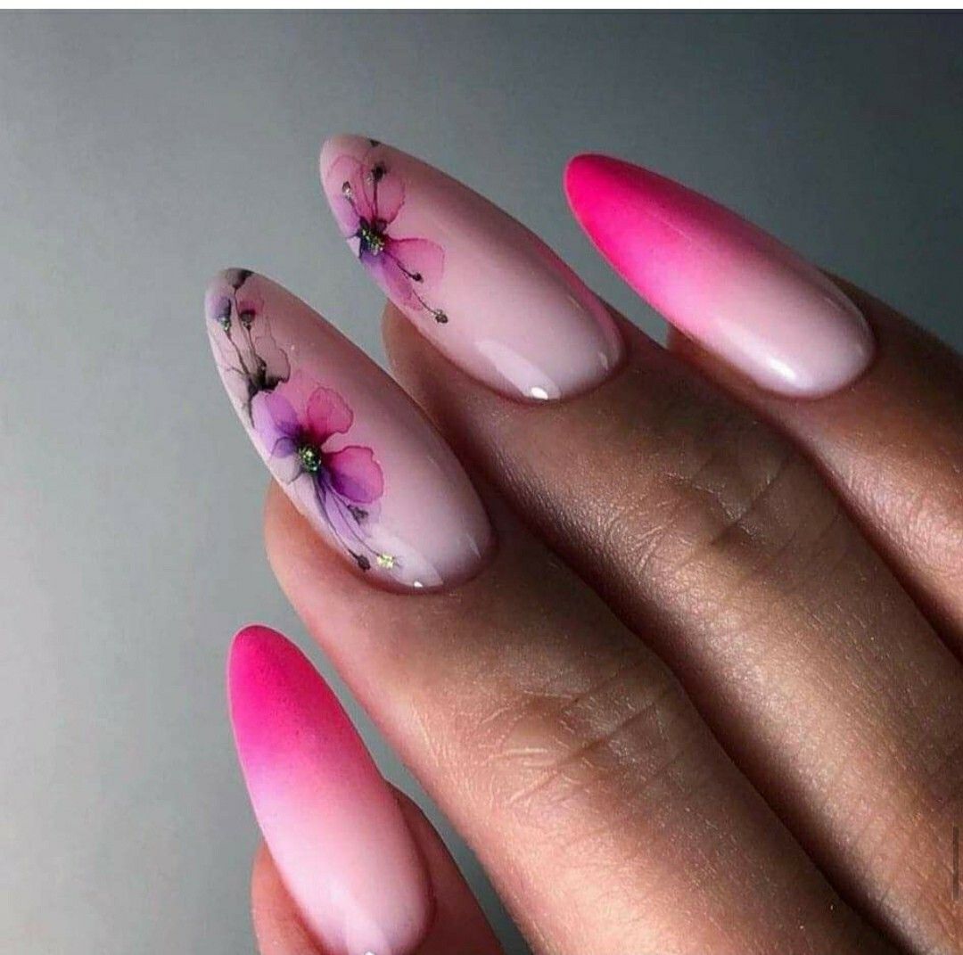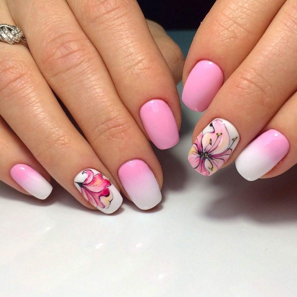 Маникюр акварельными красками смотрится невероятно нежно и воздушно. Благодаря использованию специальной акварели рисунок получается легким и полупрозрачным с эффектом градиента. На фото ниже вы можете видеть пример такого стильного и нежного нейл-арта.