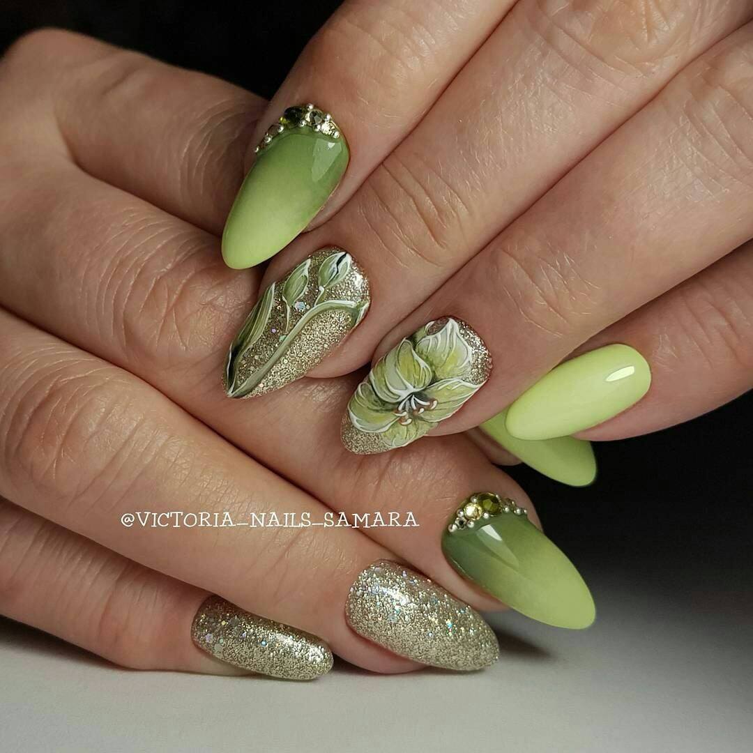 Оливковый цвет на ногтях смотрится при условии, что они средней длины. Слишком короткие с таким оттенком кажутся широкими, а чрезмерно длинные — тусклыми.