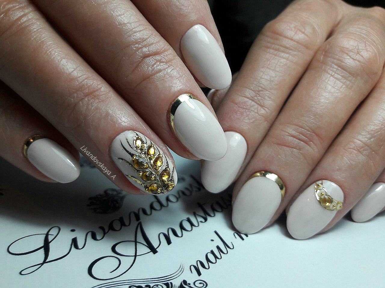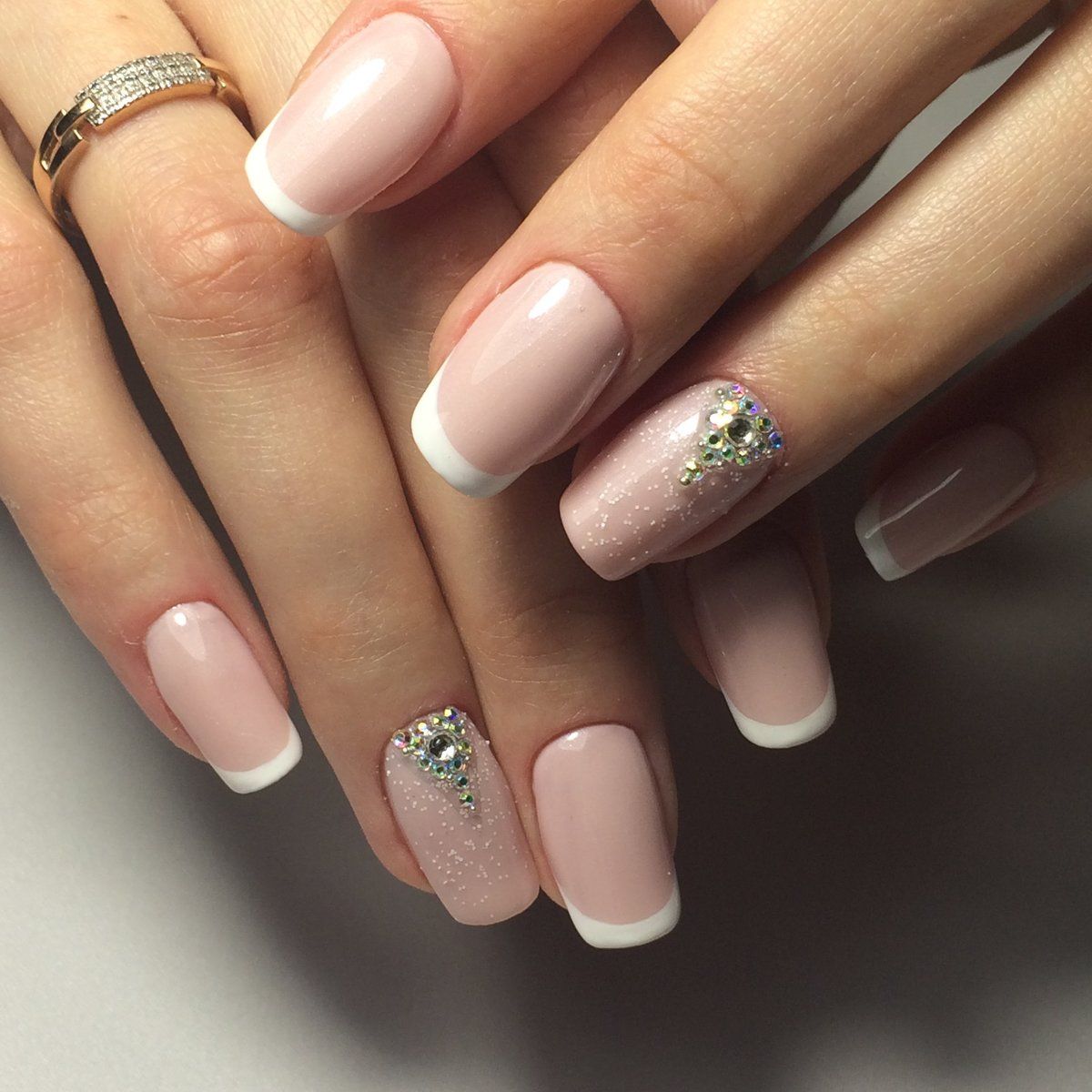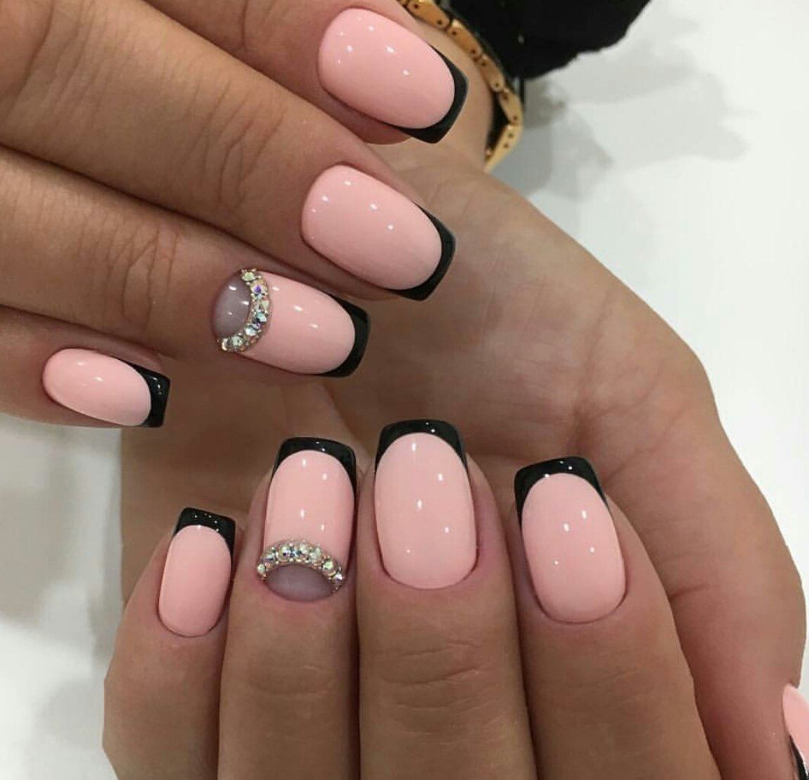 Дизайн со стразами выглядит уместно на коротких ногтях, но, если сверкающий декор небольшого размера.
