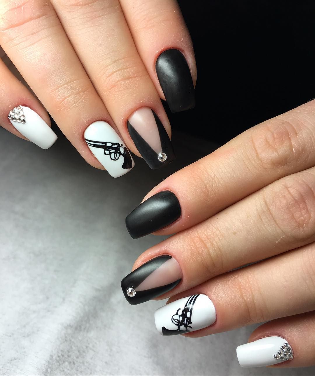 Также сочетание черно-белого можно использовать для рисования на ногтях галстучков и воротничков, которое, естественно, предполагает наличие белой улыбочки.