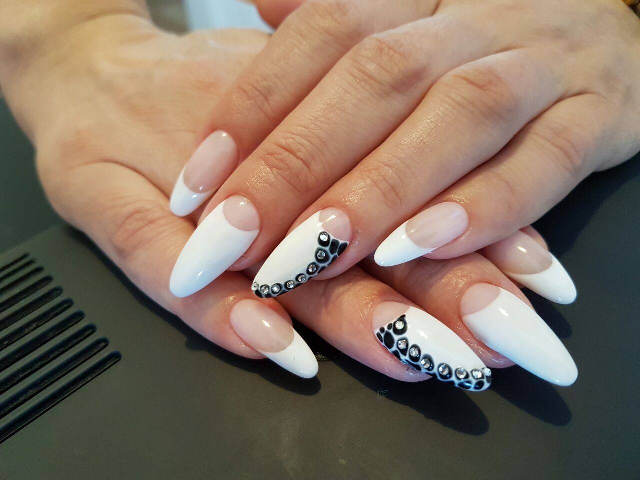 На белой улыбке нарощенных ногтей будут замечательно смотреться черные абстракции и узоры. Подобный нейл-арт считается классическим, и в тоже время привлекает своей неповторимостью.