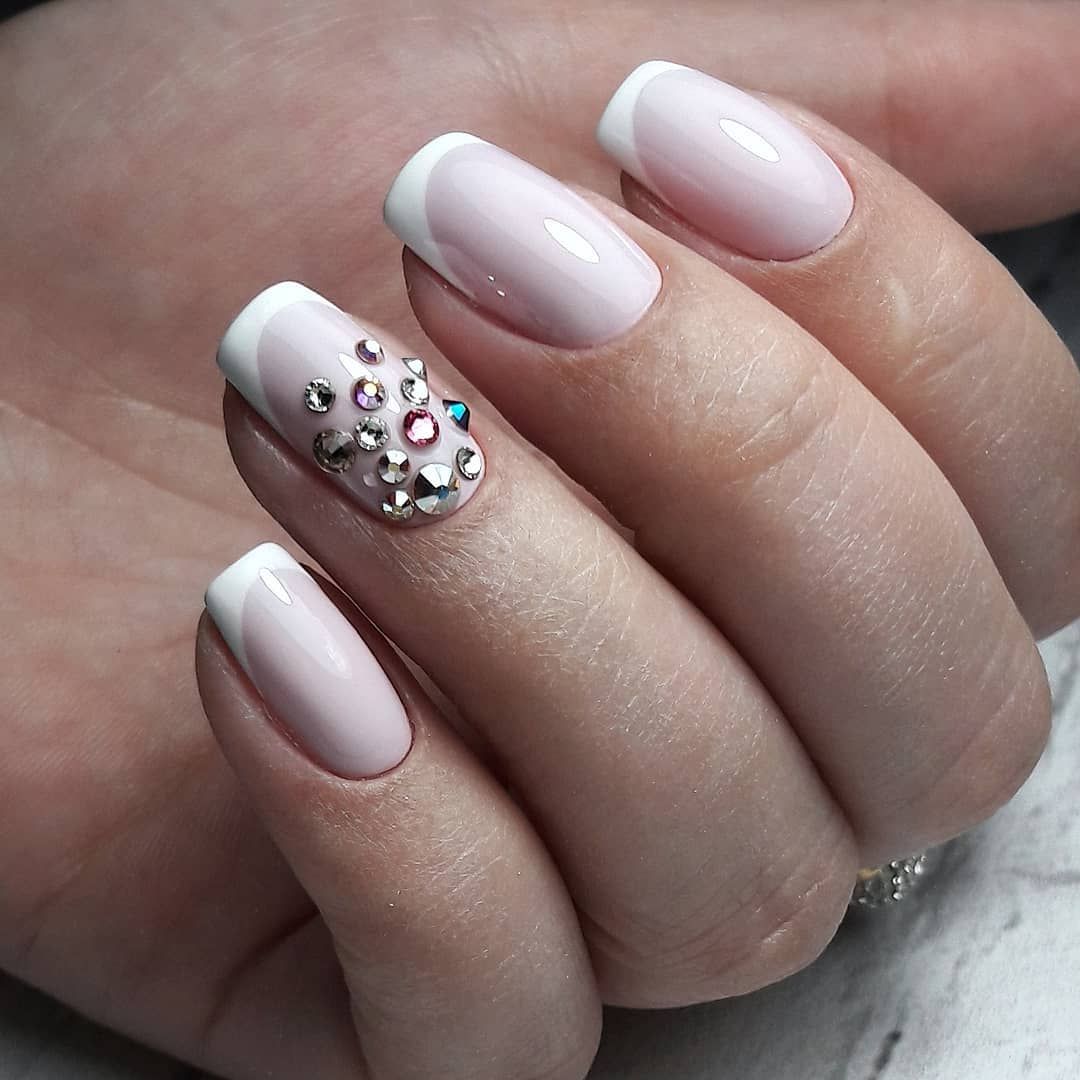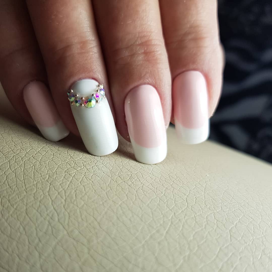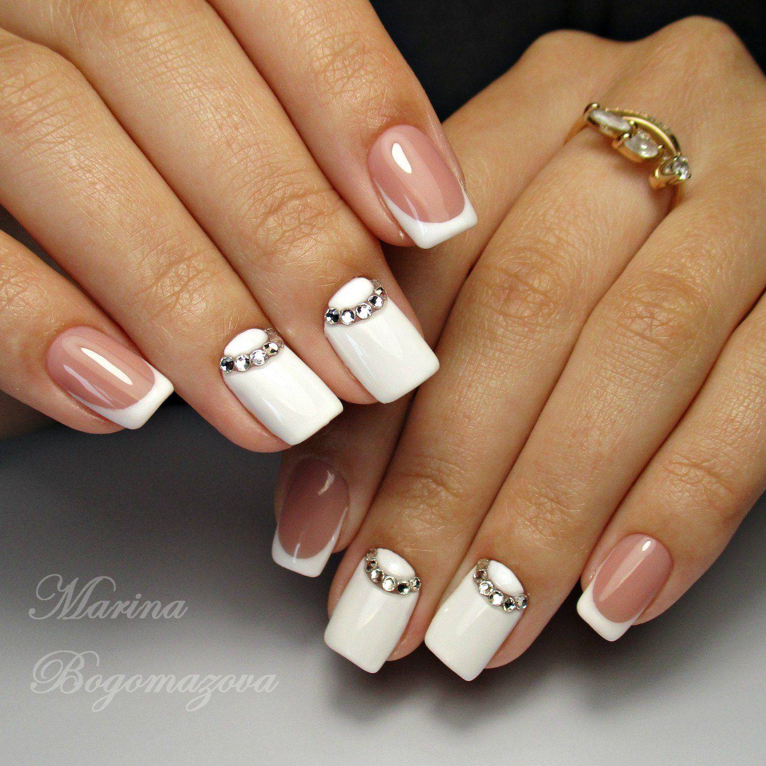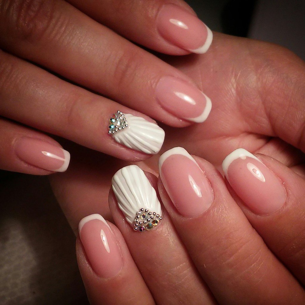 Элементы декора для белого французского маникюра подчеркивают нежность, женственность. Такие дизайны идеально подходят для свадьбы, других торжественных мероприятий. Лучшие идеи с рисунками и декоративными элементами: