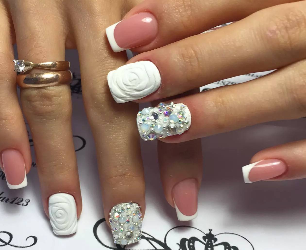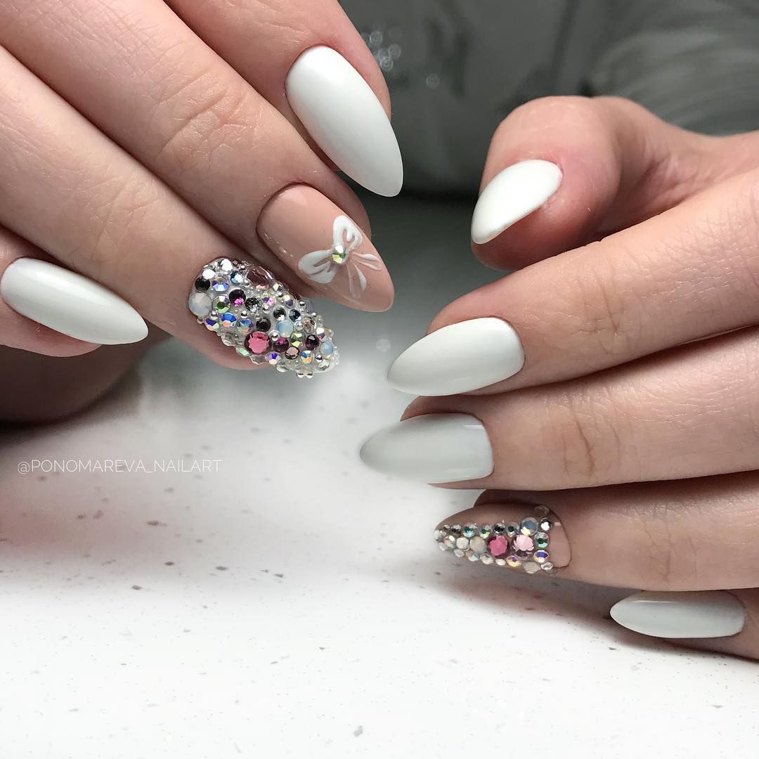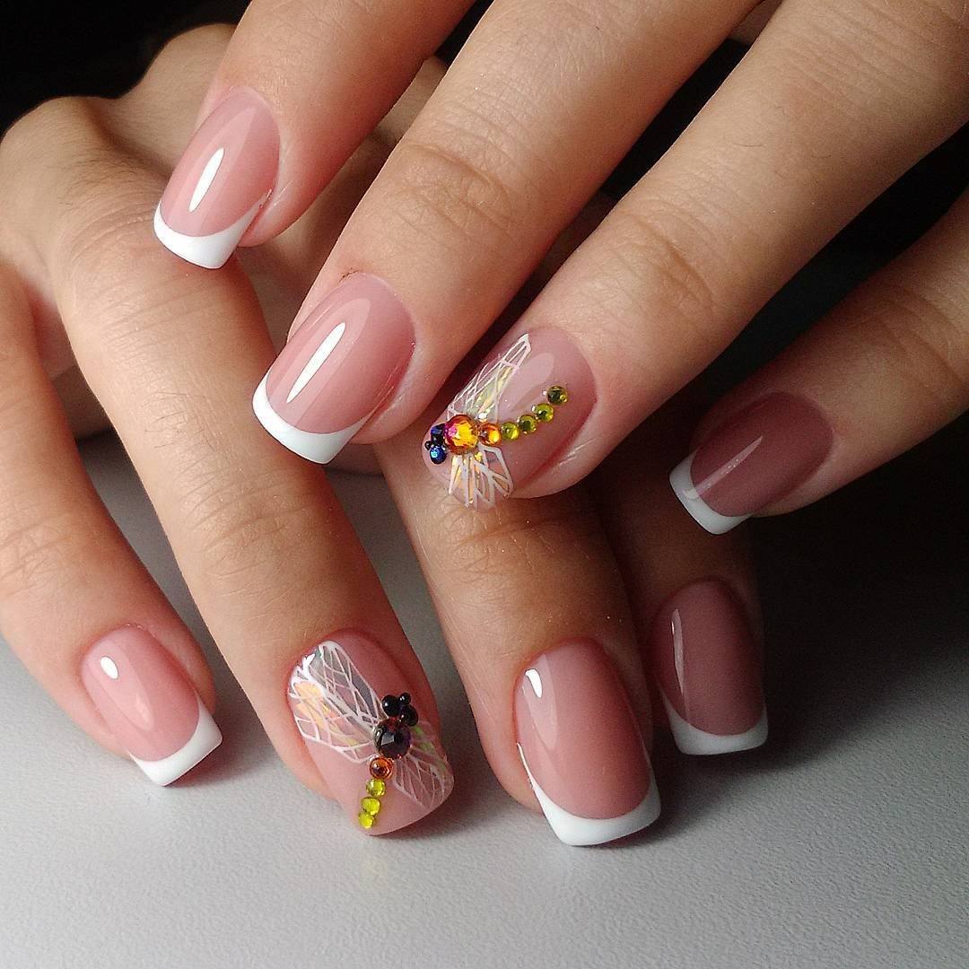 Элементы декора для белого французского маникюра подчеркивают нежность, женственность. Такие дизайны идеально подходят для свадьбы, других торжественных мероприятий. Лучшие идеи с рисунками и декоративными элементами: