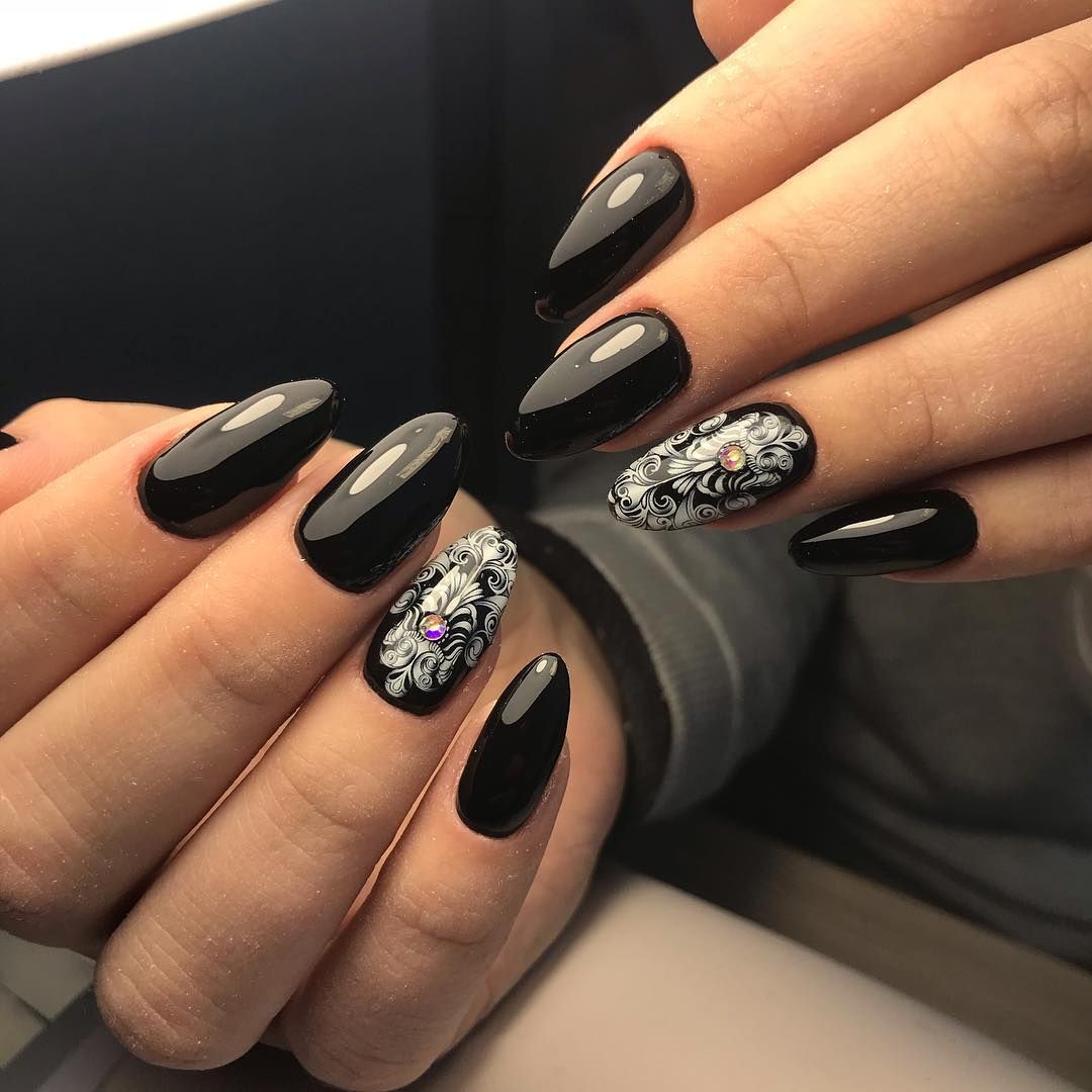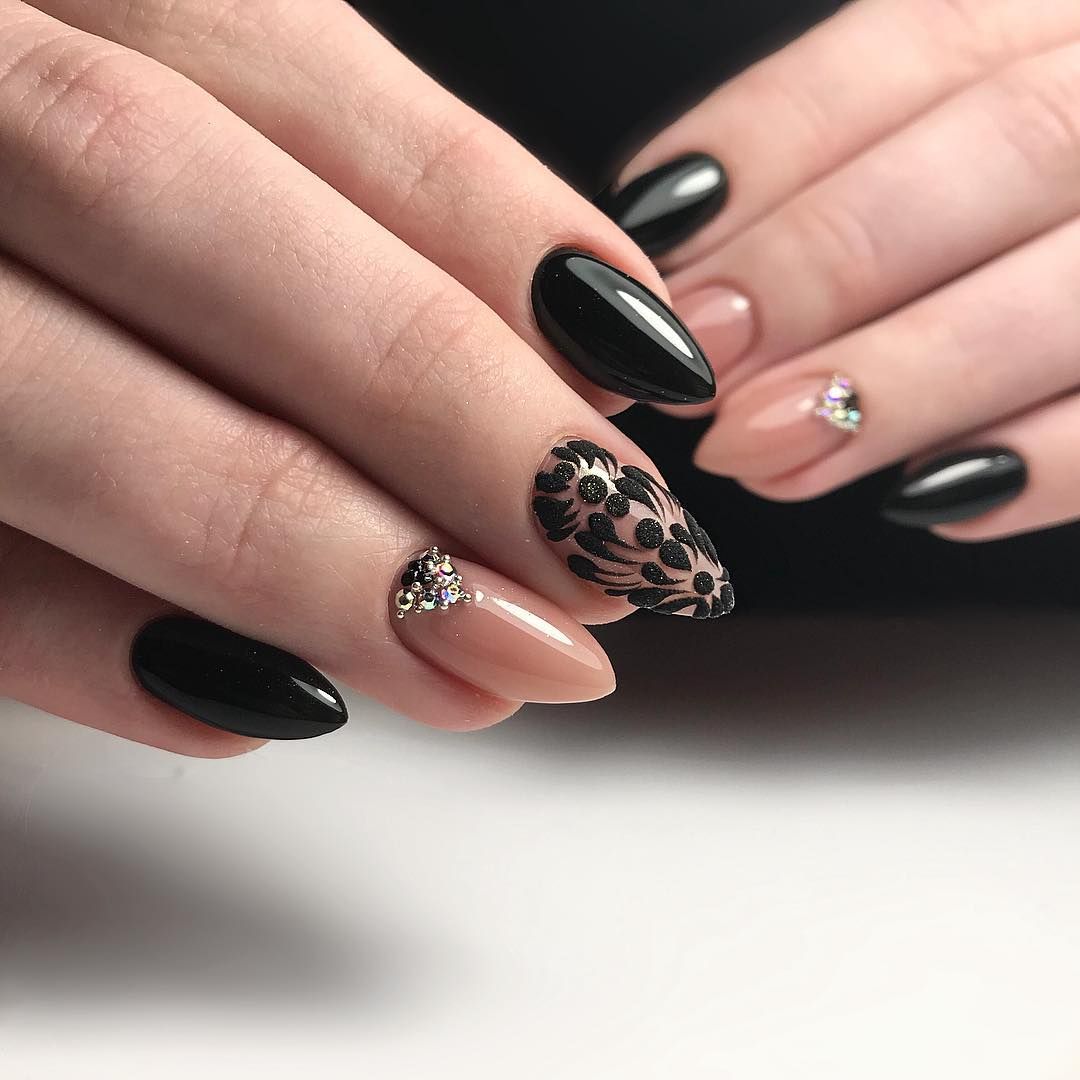 Для девушек с длинными ногтями превосходно подходит элегантное черное кружево с оригинальным дымчатым переходом.