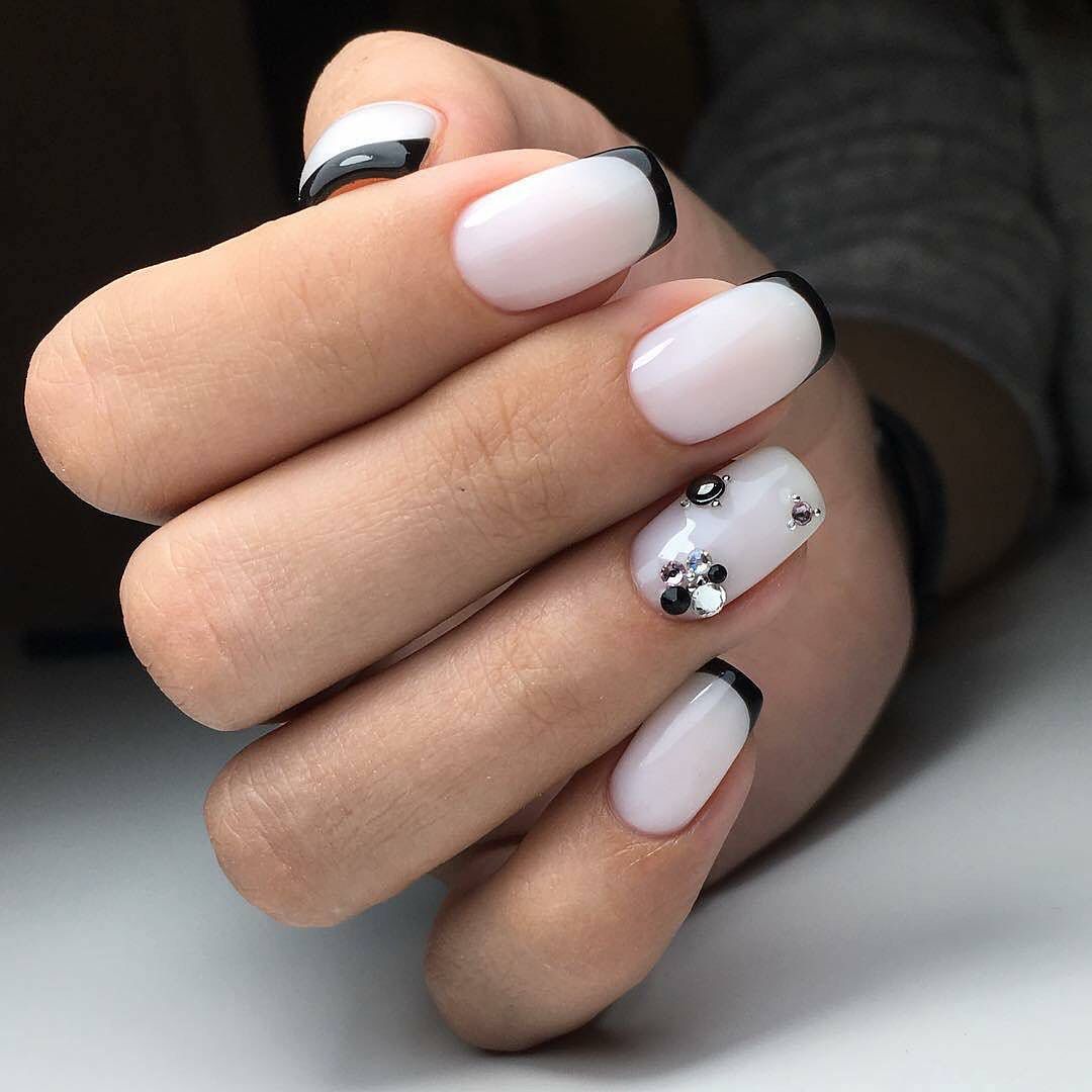 Еще один интересный вариант – сделать белый френч на черных ногтях. Такая комбинация смотрится в меру строго и очень модно.
