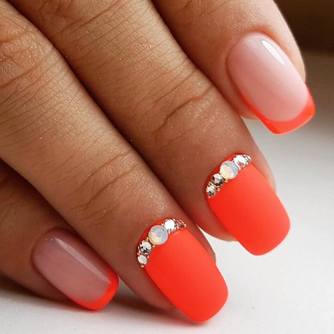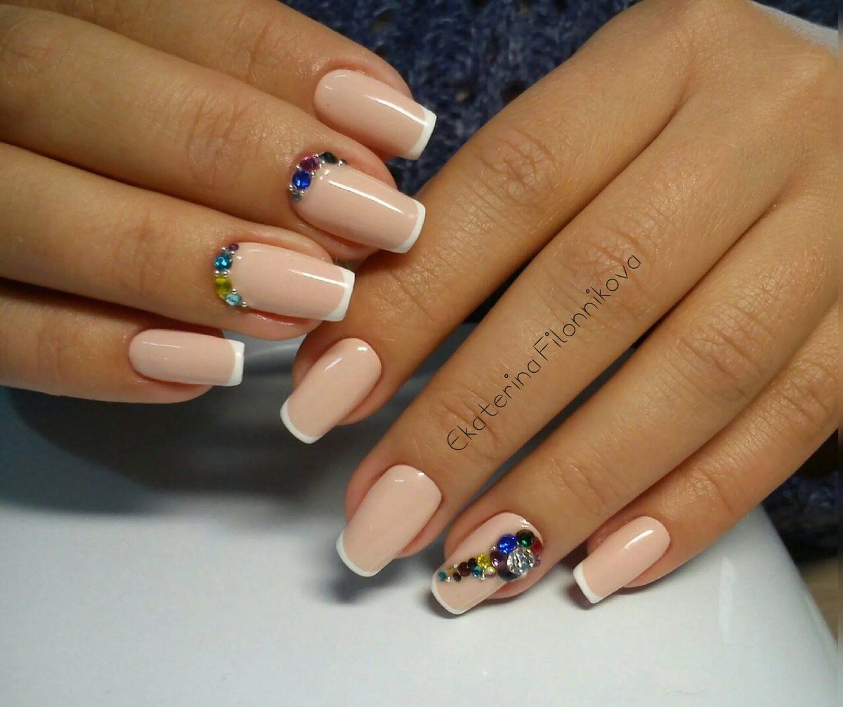 Нелепо смотрится большое количество блесток и страз. Поэтому, при нанесении французского маникюра в этом сезоне, следует ограничиться минимальным их количеством. Для коротких ноготков идеально подходит вариант украшения не всех пальцев, а только одного или двух.