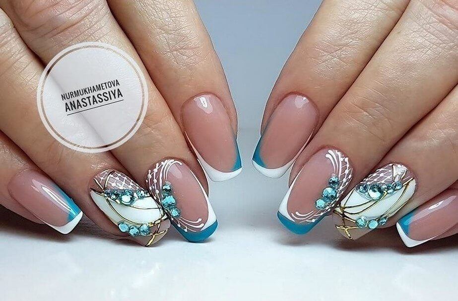 бело-голубой френч на ногти средней длинны с узором черепашки