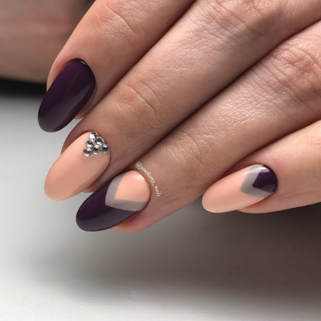 - Асимметрия. Для такого дизайна необходимо рисовать скошенные линии на ногте с разных сторон. Визуально овальная форма будет напоминать острую, скошенную.